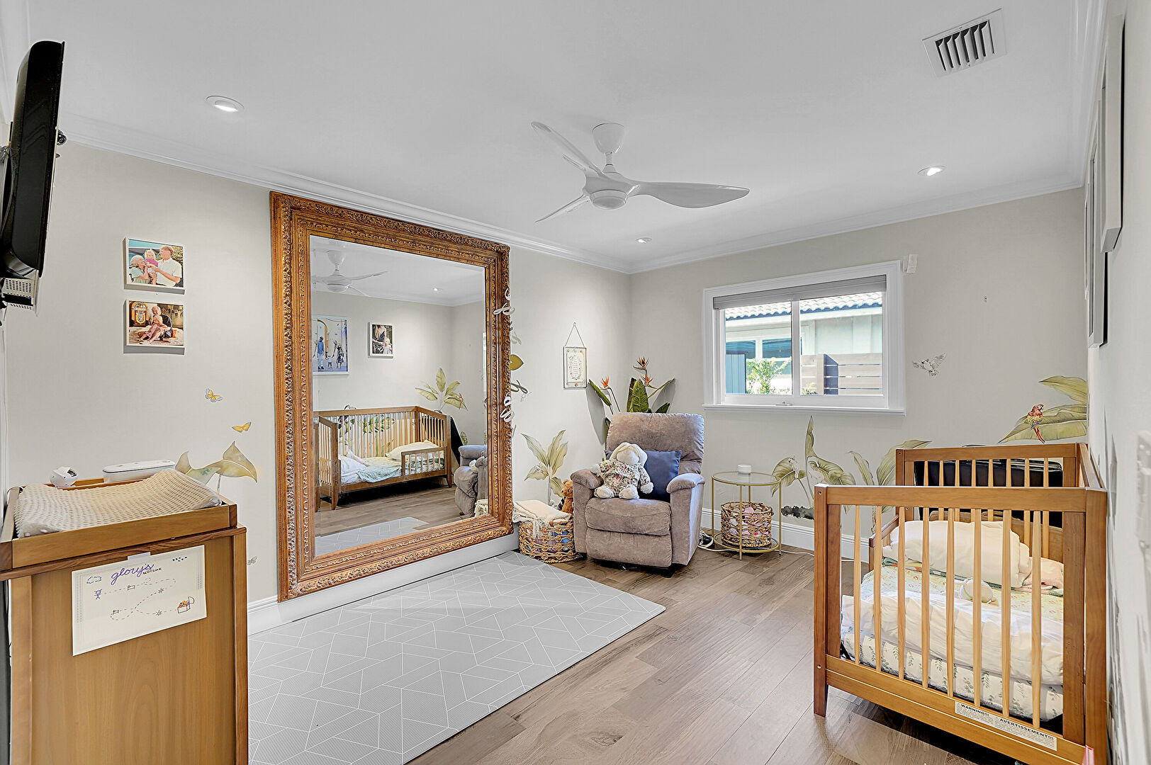 Baseboards Wall, Ceiling Fan, Crown Molding, Drywall, Natural Light, Nursery, Recessed Lighting, Vent, Wood Finish Floor, Ceiling Fan, Natural Light, Nursery