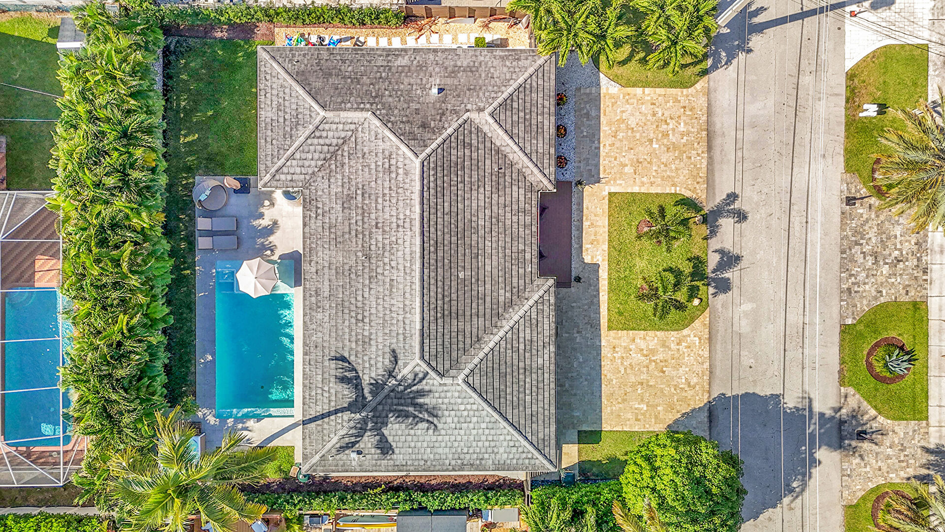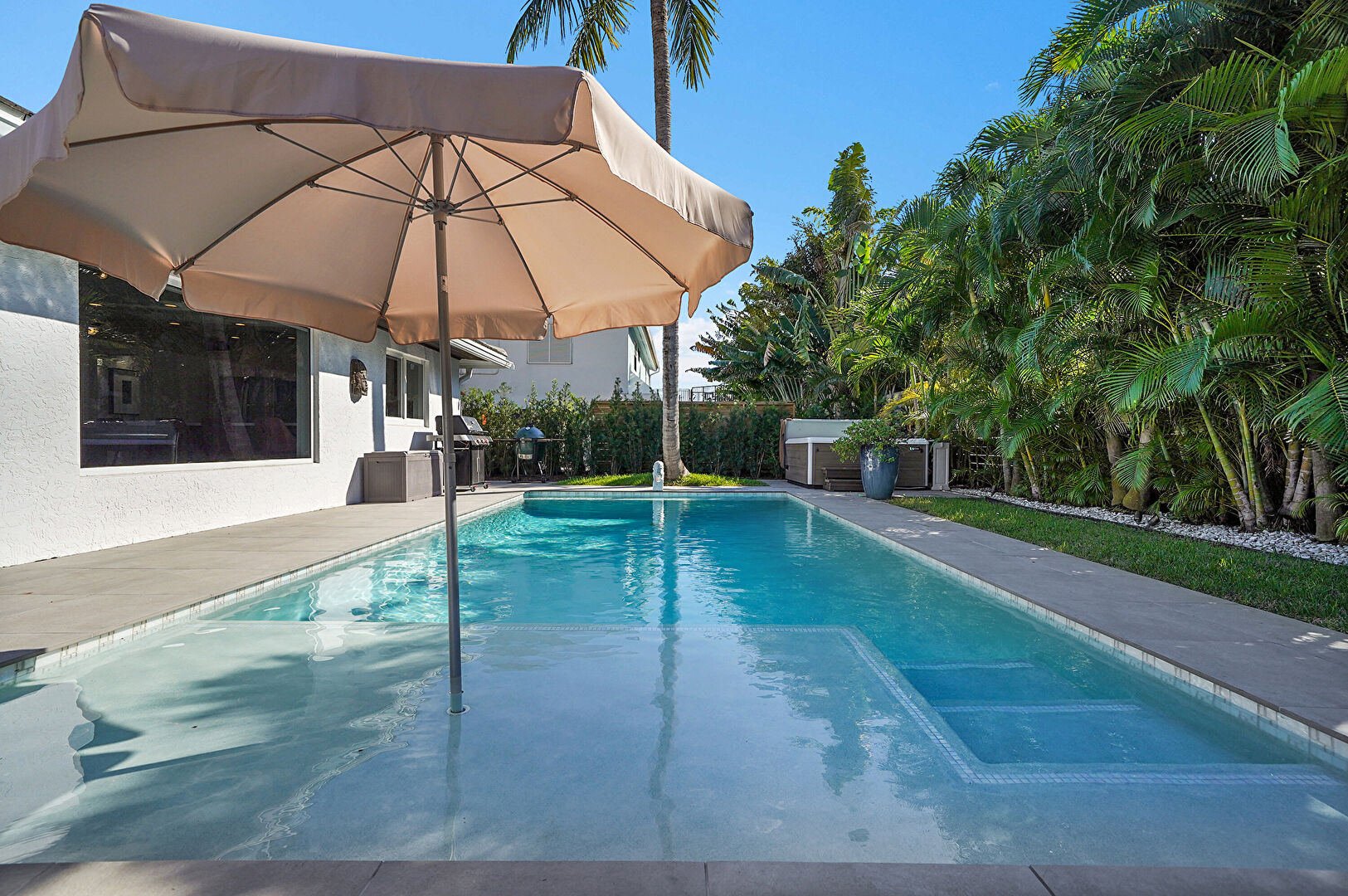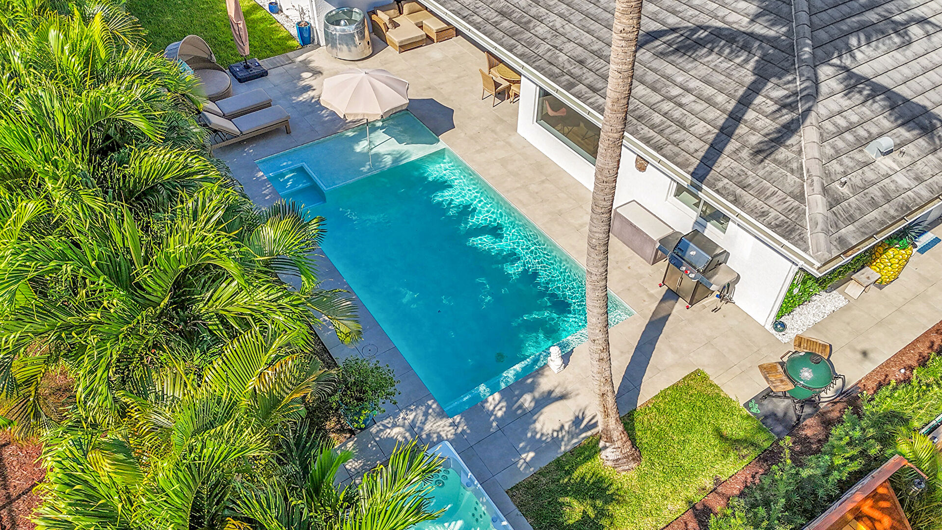 Downspout, Fence, Gutters, Lawn, Patio, Stucco Siding, Pool