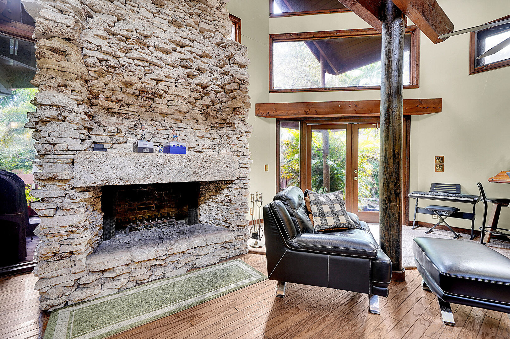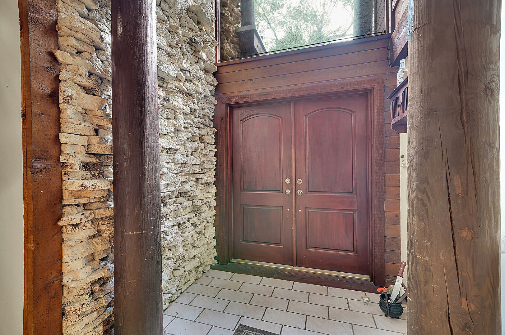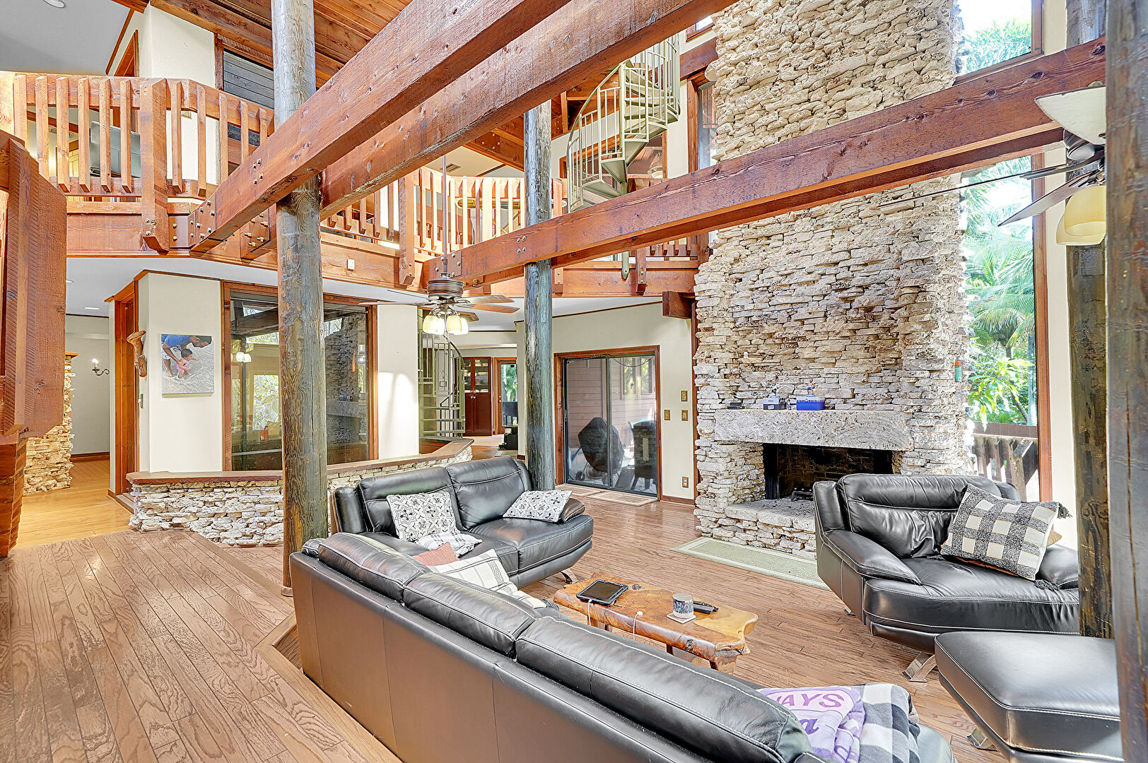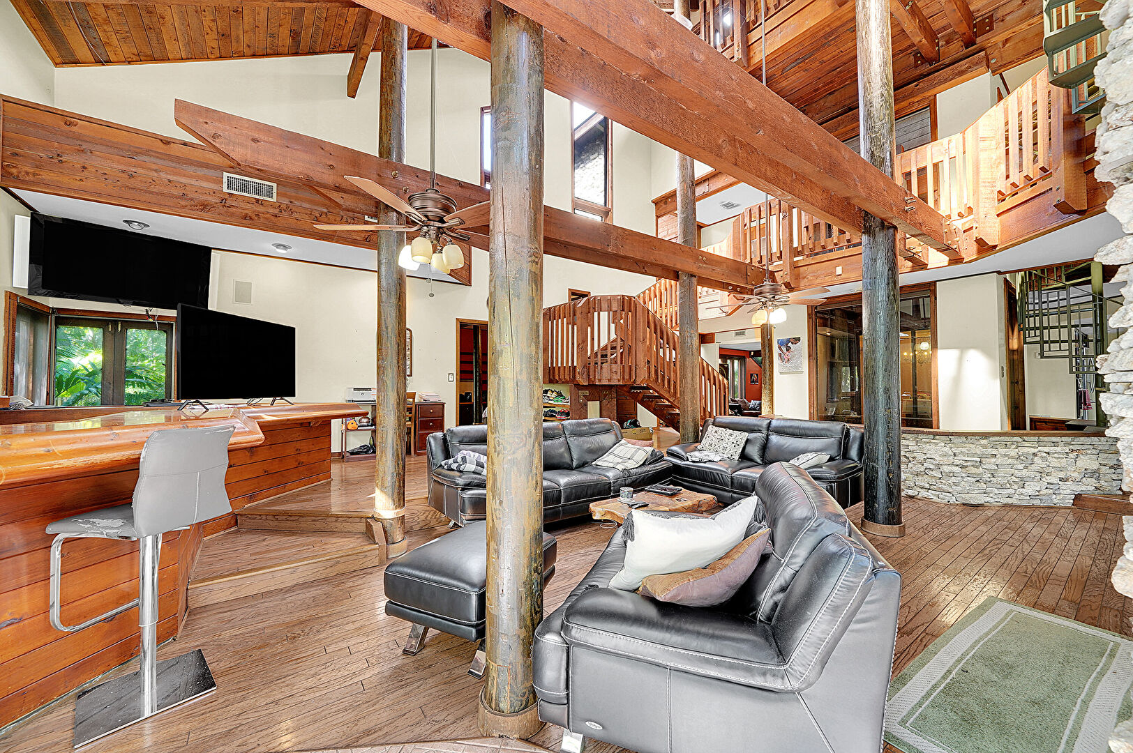 Baseboards Wall, Beamed Ceiling, Ceiling Fan, Crown Molding, Drywall, Fireplace, French Doors, High Ceiling, Natural Light, Recessed Lighting, Stairs, Stone Wall, Tile Floor, Vaulted Ceiling, Vent, Wood Ceiling, Wood Finish Floor, Baseboards Wall, Beamed Ceiling, Drywall, High Ceiling, Indoor Bar, Stone Wall, Vaulted Ceiling, Wood Finish Floor