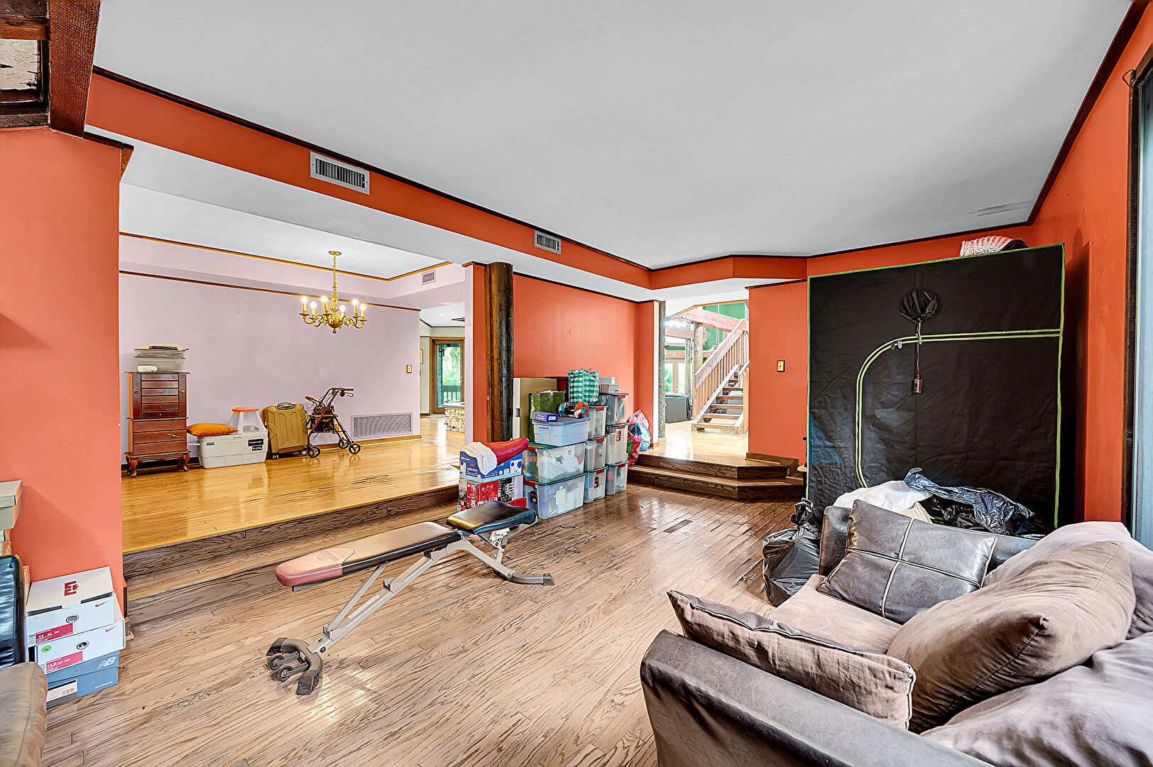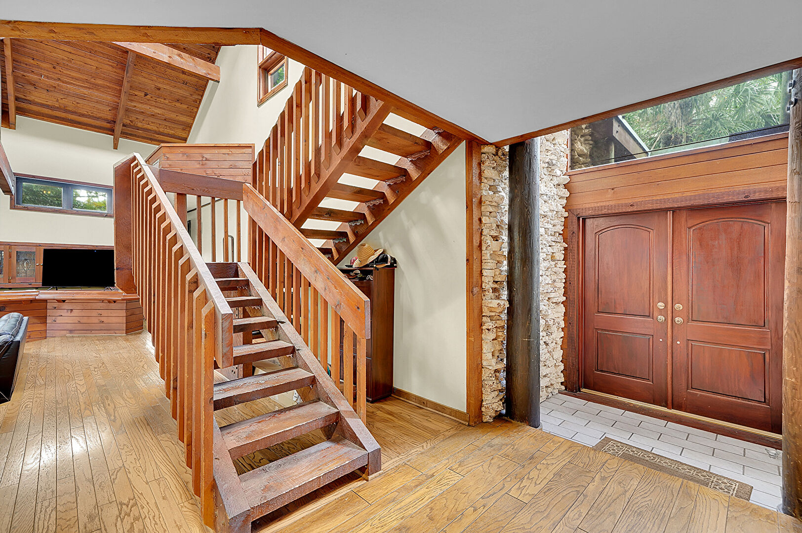 Baseboards Wall, Drywall, Natural Light, Notable Chandelier, Stairs, Tray Ceiling, Vaulted Ceiling, Vent, Wood Finish Floor, Wood Wall, Drywall, Natural Light, Wood Finish Floor