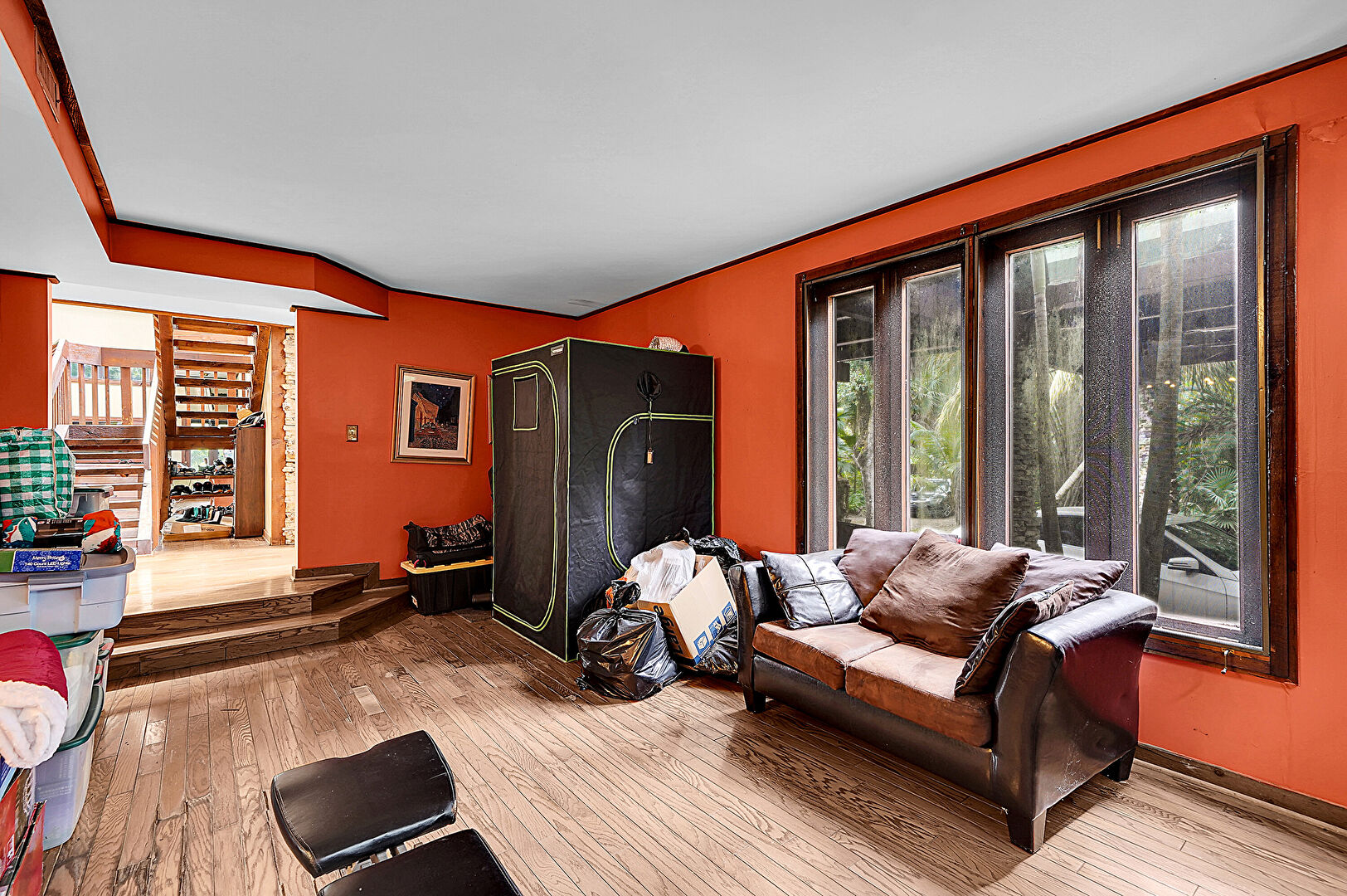 Crown Molding, Drywall, Natural Light, Recessed Lighting, Stairs, Stone Wall, Vent, Wood Finish Floor, Baseboards Wall