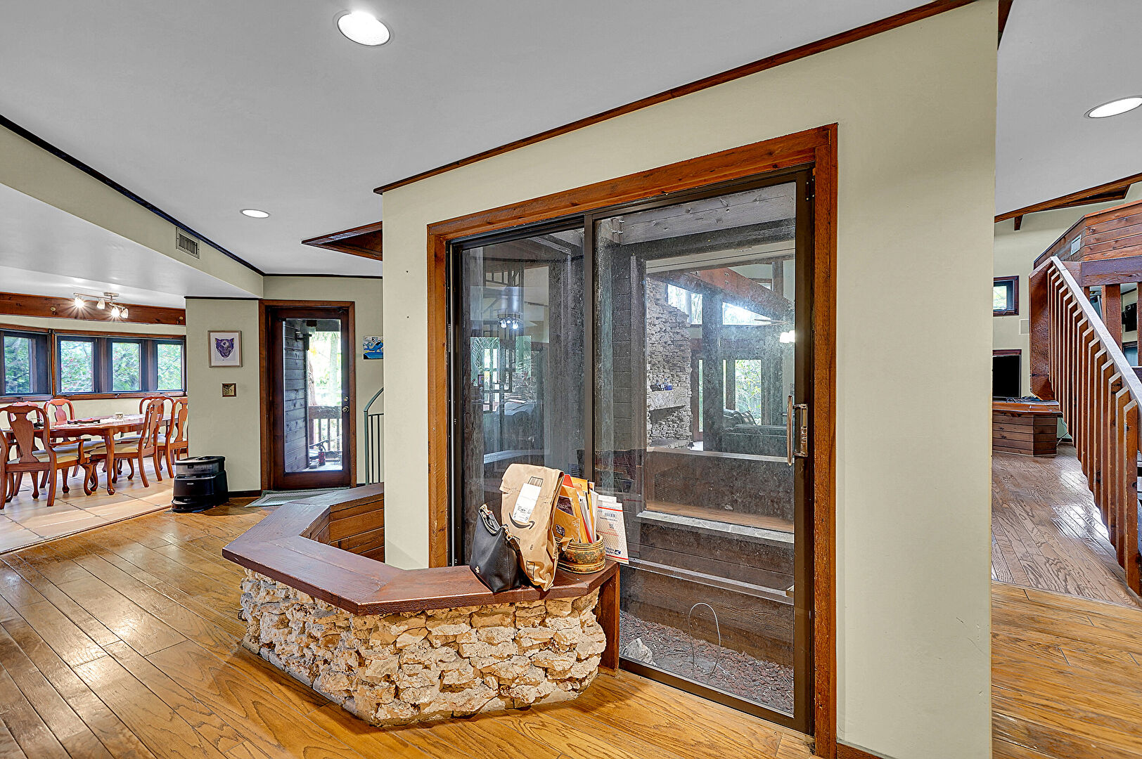 Baseboards Wall, Crown Molding, Drywall, Natural Light, Stone Wall, Vent, Wood Wall, Stone Siding, Wood Finish Floor