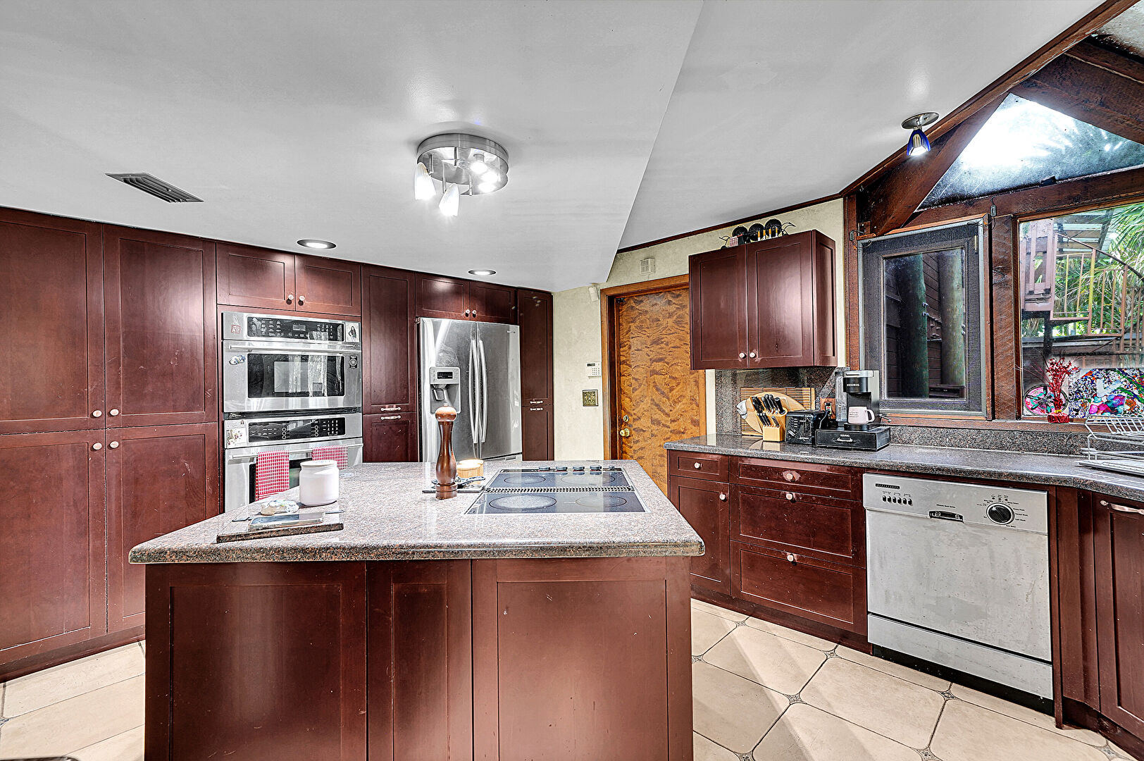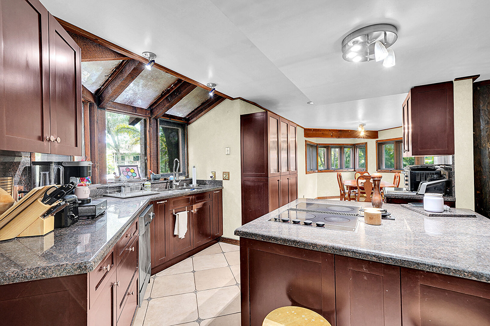 Baseboards Wall, Beamed Ceiling, Dark Brown Cabinets, Double Oven, Drywall, Kitchen Island, Kitchen Peninsula, Natural Light, Recessed Lighting, Reddish Brown Cabinets, Shaker Cabinets, Stone Countertops, Tile Floor, Vaulted Ceiling, Vent, Wine Cooler, Drywall, Shaker Cabinets, Stone Countertops