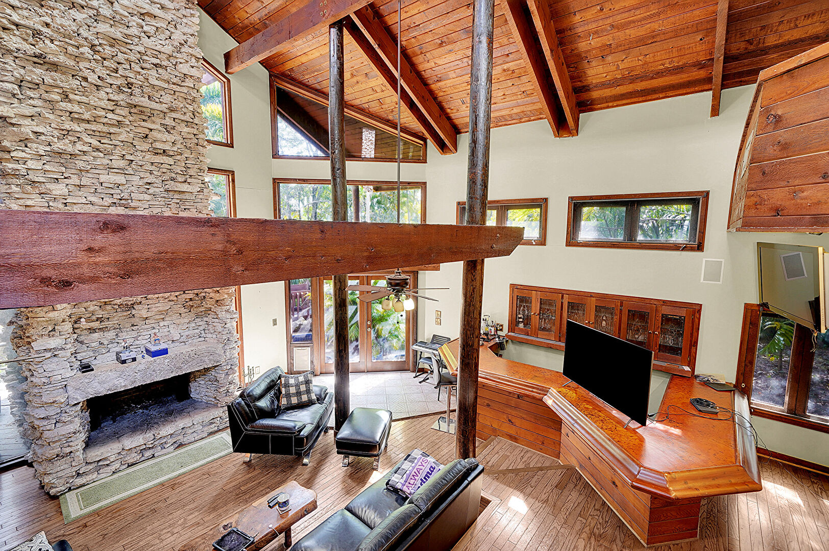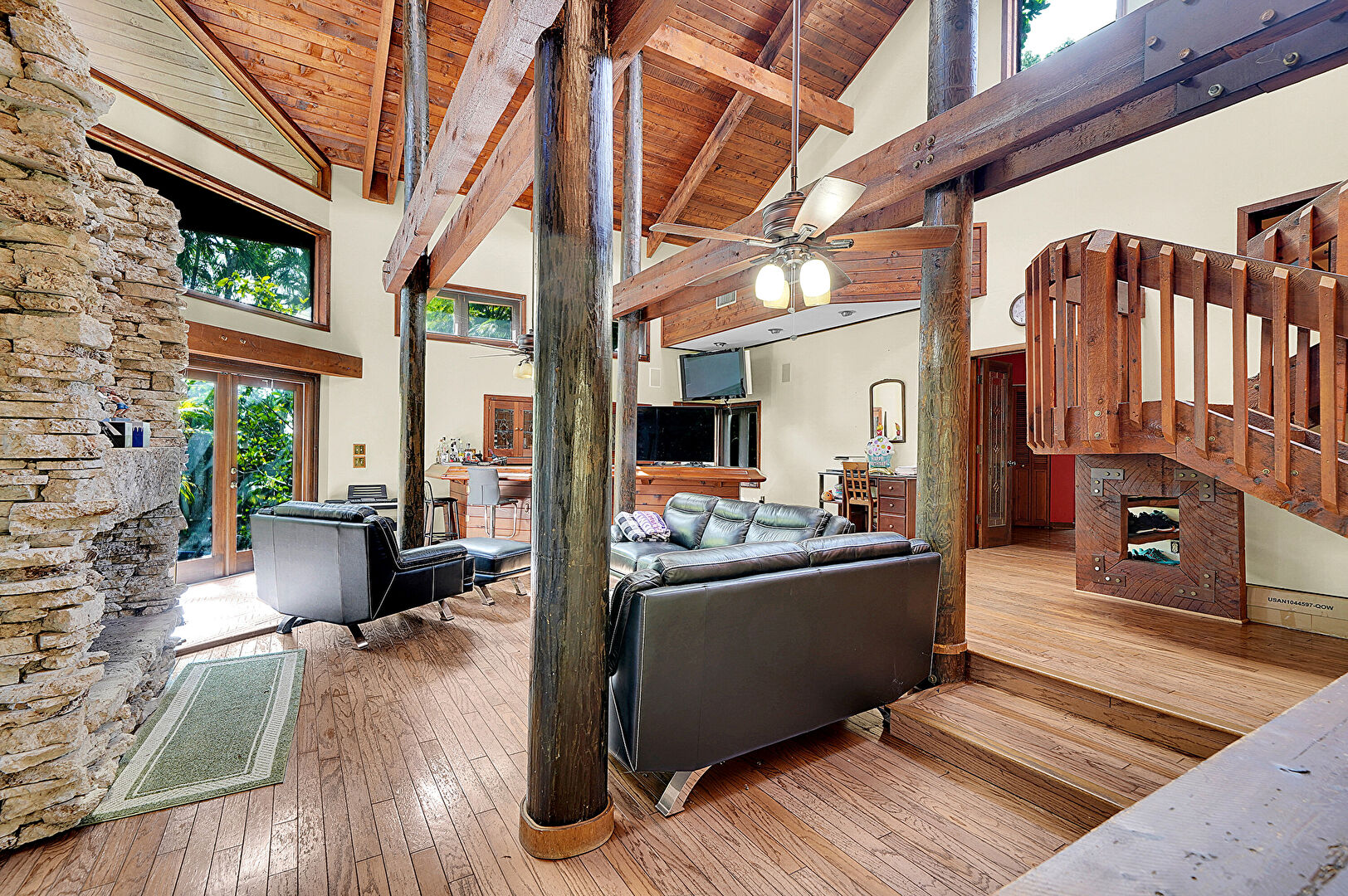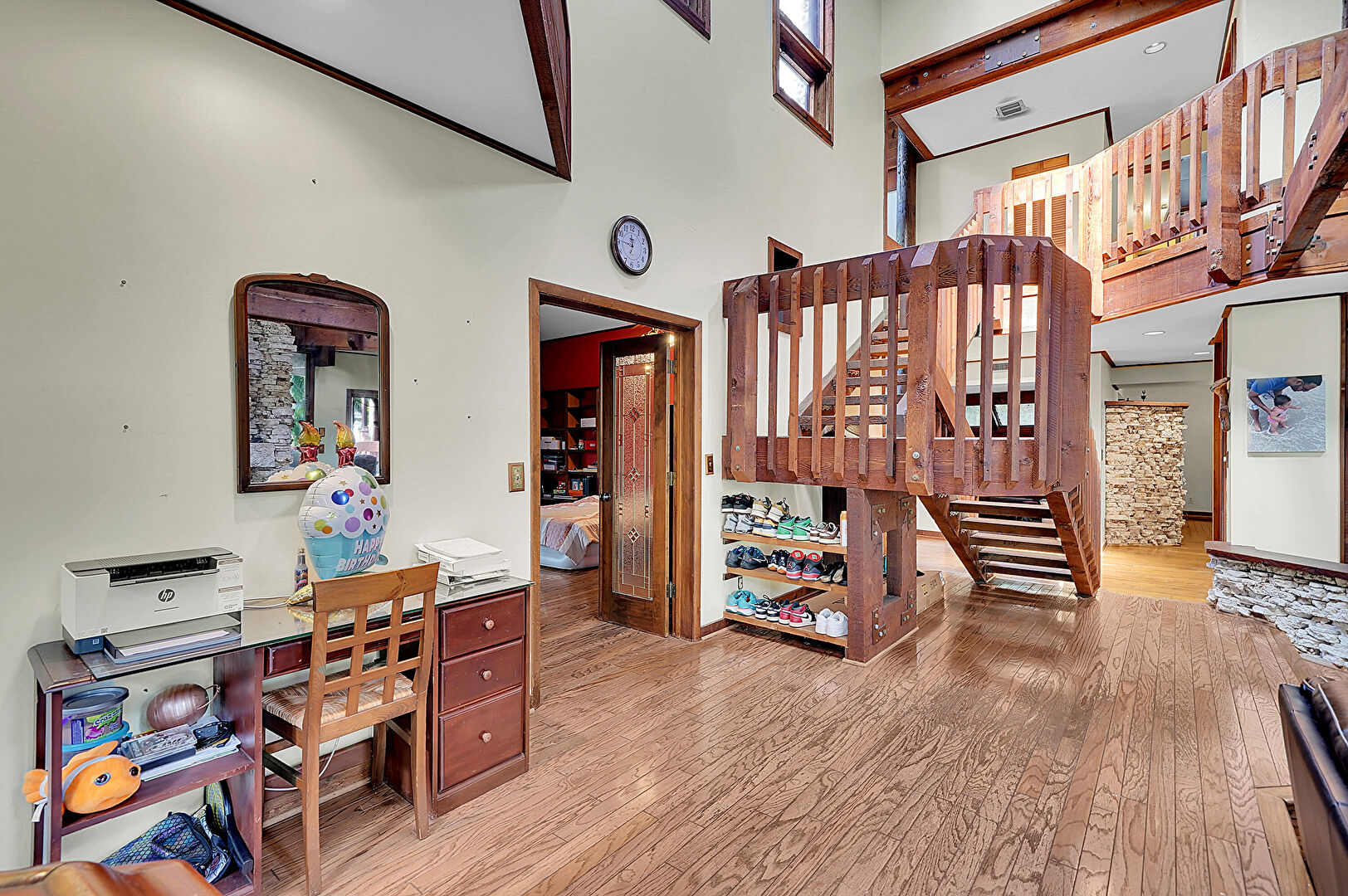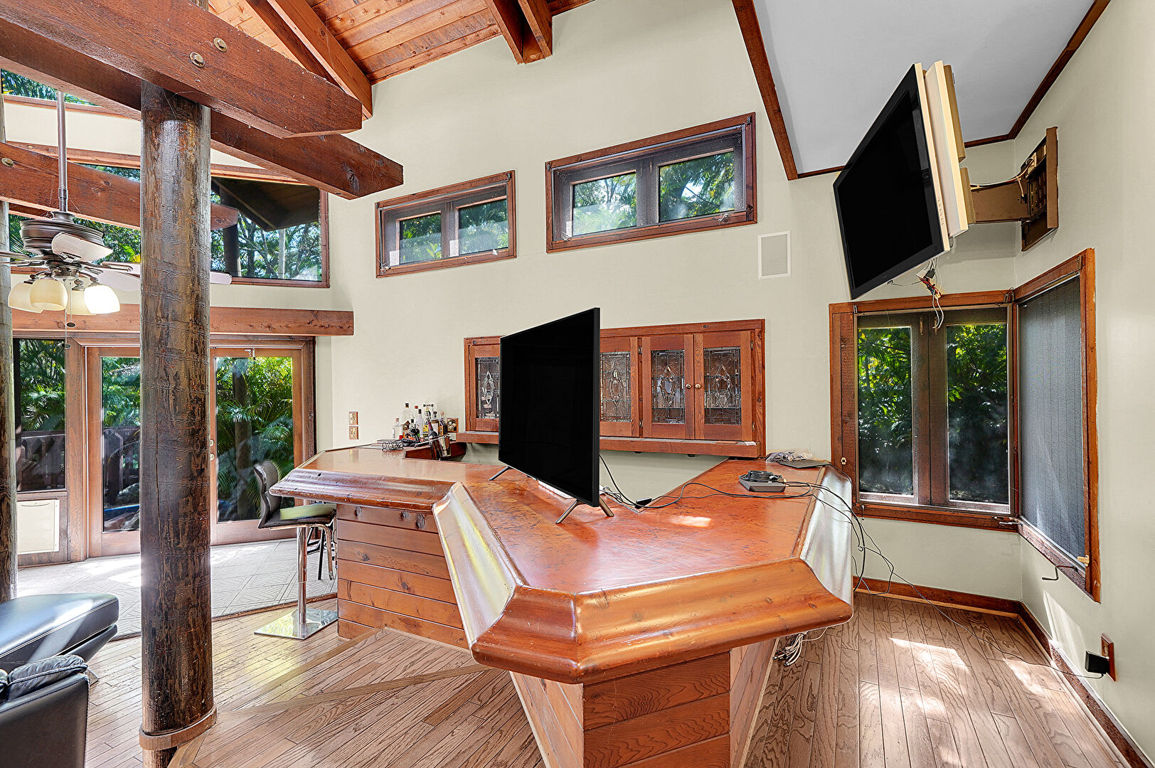 Baseboards Wall, Beamed Ceiling, Butcher Block Countertops, Ceiling Fan, Drywall, High Ceiling, Indoor Bar, Natural Light, Office Area, Vaulted Ceiling, Vent, Wood Ceiling, Wood Finish Floor, Beamed Ceiling, Wood Finish Floor