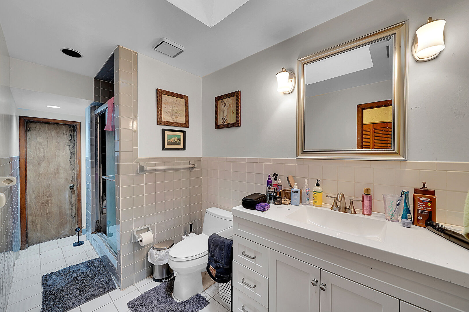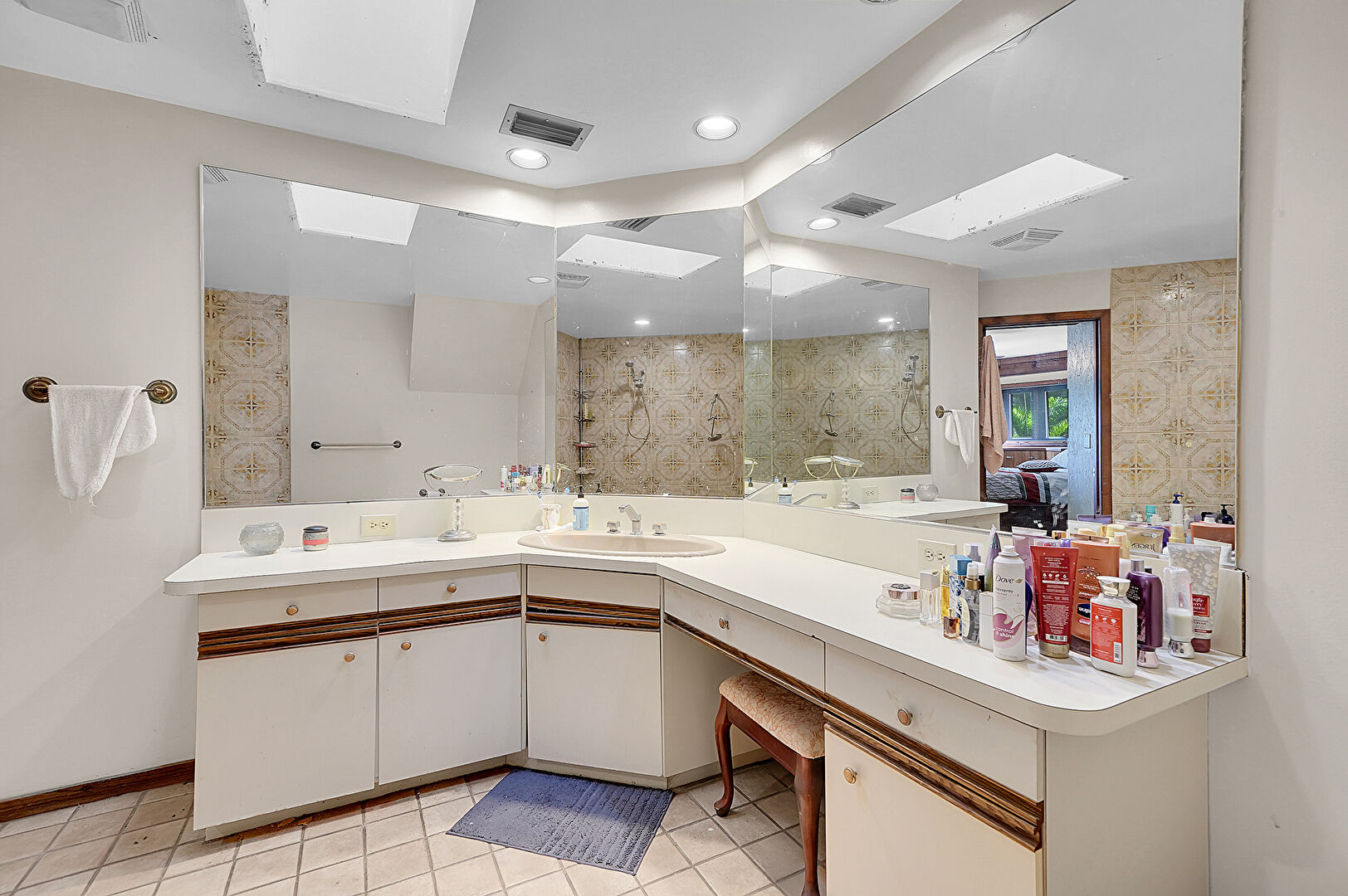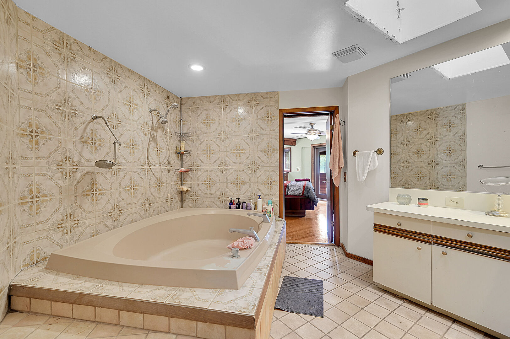 Accent Wall, Baseboards Wall, Ceiling Fan, Combined Bath Shower, Drywall, Ensuite Bathroom, Full Bathroom, Natural Light, Recessed Lighting, Skylight, Tile Floor, Vanity, Vent, Full Bathroom, Recessed Lighting, Tile Floor
