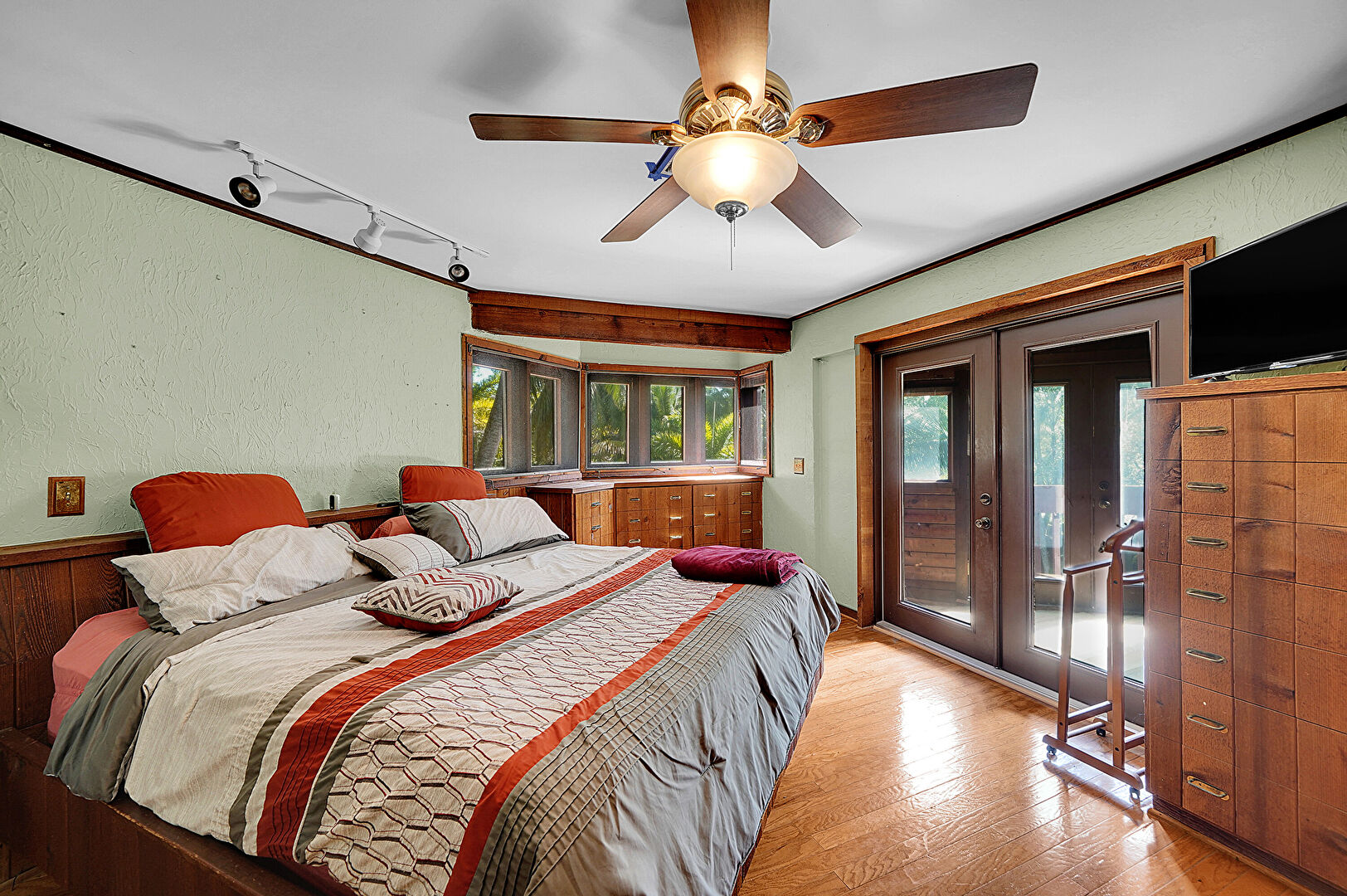 Access To Exterior, Baseboards Wall, Beamed Ceiling, Ceiling Fan, Closet, Crown Molding, Drywall, French Doors, Natural Light, Textured Wall, Track Lighting, Two Closets, Vent, Wood Finish Floor, Wood Wall, Baseboards Wall, Crown Molding, Drywall, Textured Wall, Wainscot Wall
