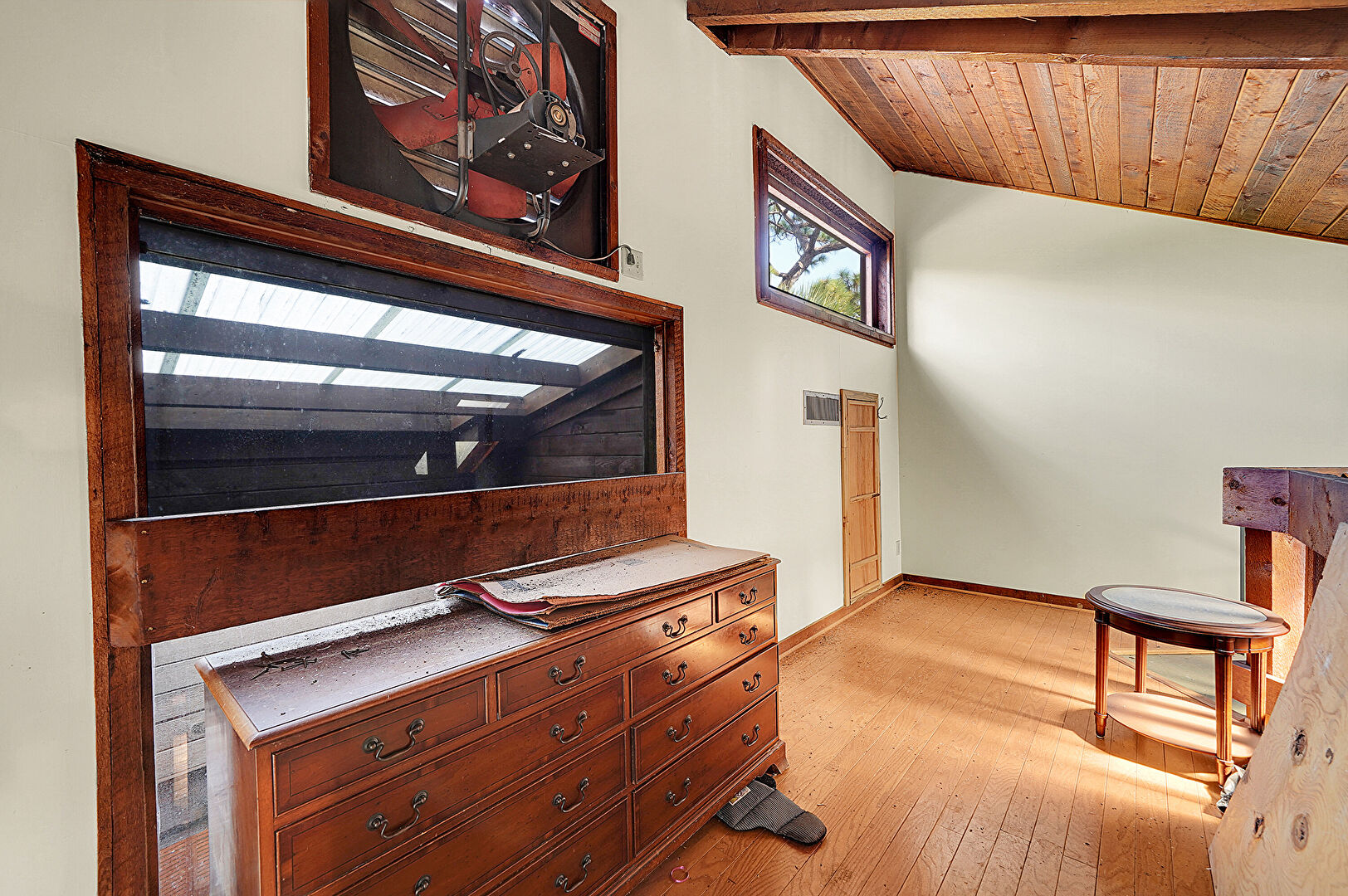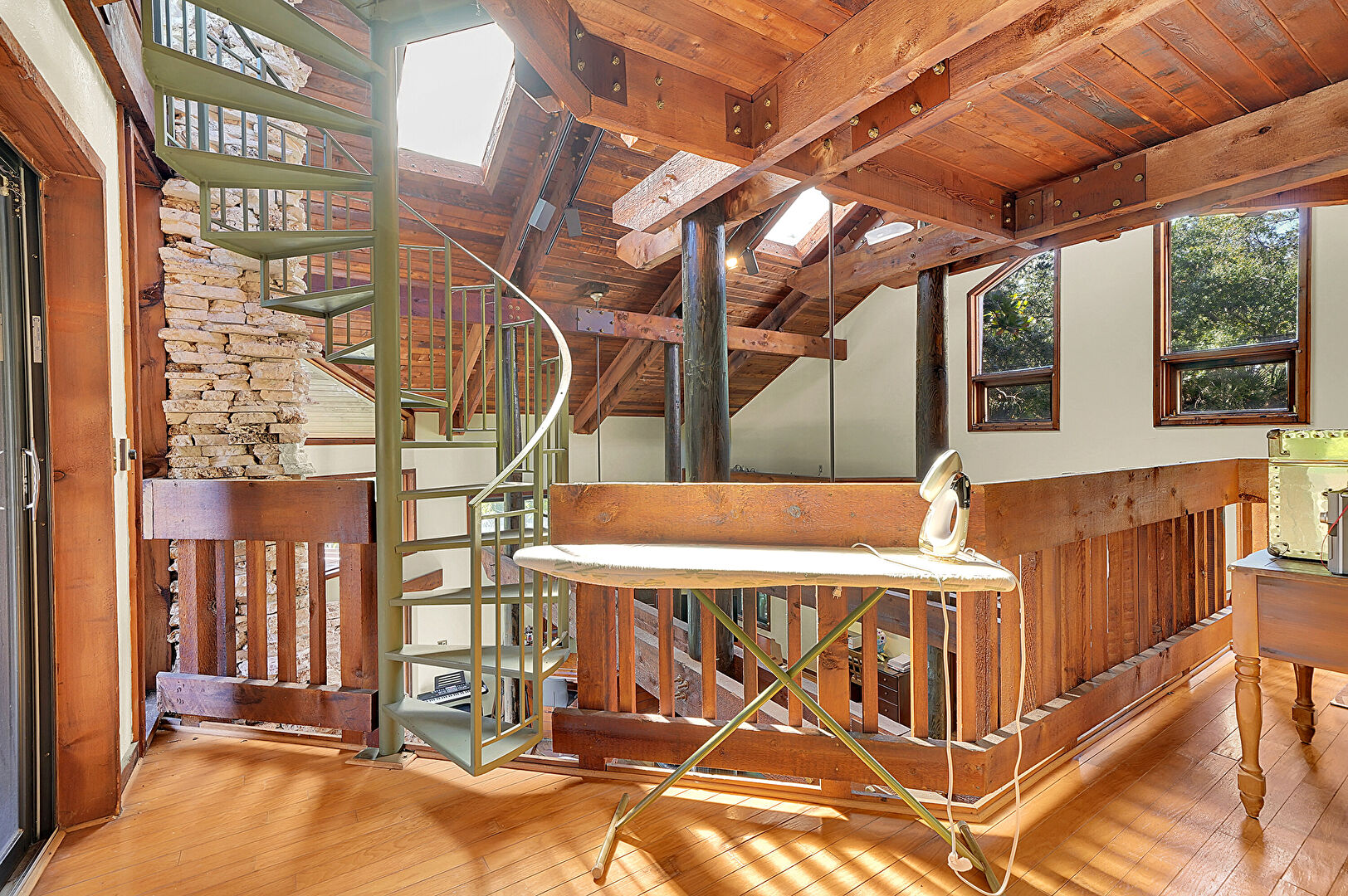 Baseboards Wall, Beamed Ceiling, Drywall, High Ceiling, Loft, Natural Light, Upstairs Landing, Vaulted Ceiling, Vent, Wood Ceiling, Wood Finish Floor, Drywall, Wood Ceiling