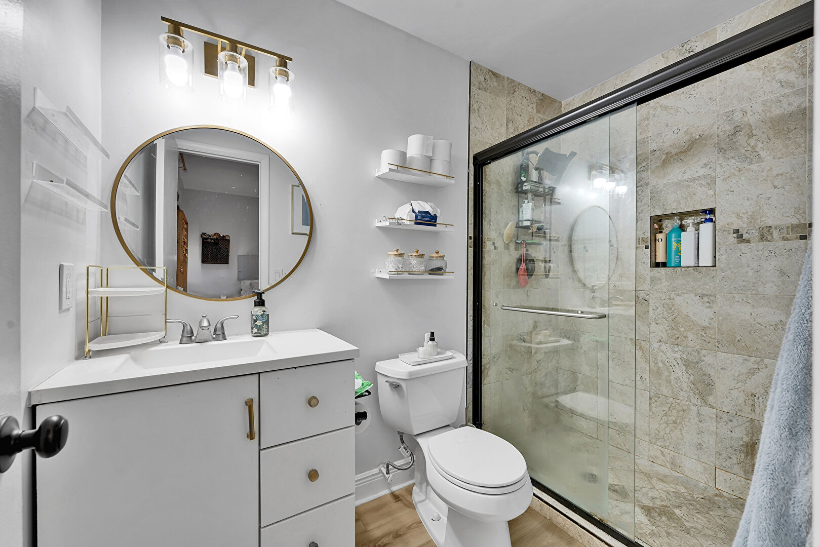 Baseboards Wall, Drywall, Full Bathroom, Tile Floor, Vanity, Wood Finish Floor, Combined Bath Shower, Full Bathroom, Vanity