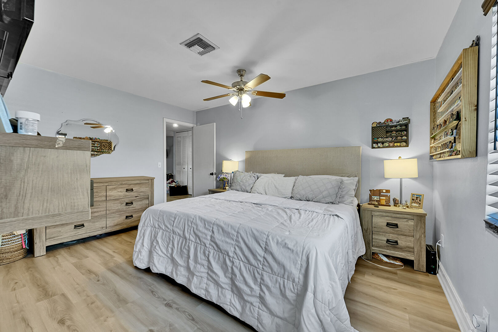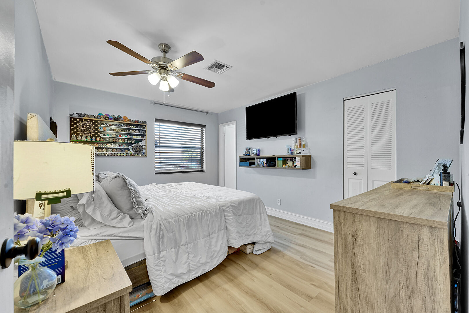 Baseboards Wall, Ceiling Fan, Drywall, Natural Light, Vaulted Ceiling, Vent, Wood Finish Floor, Ceiling Fan, Closet, Wood Finish Floor