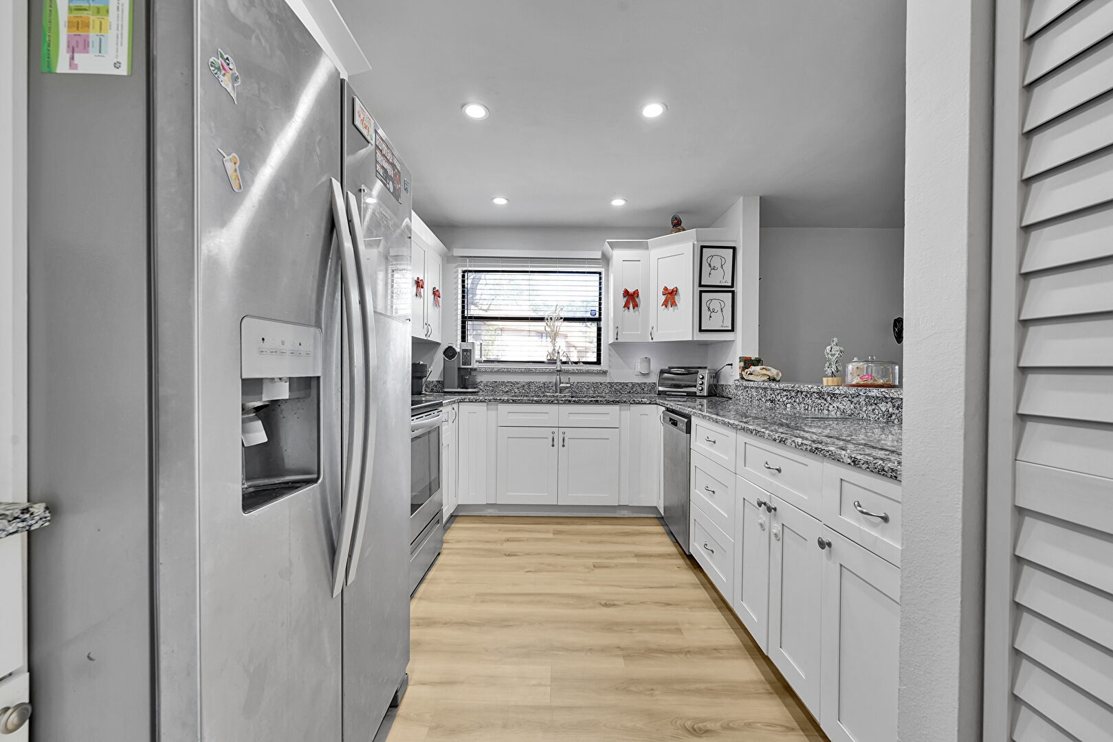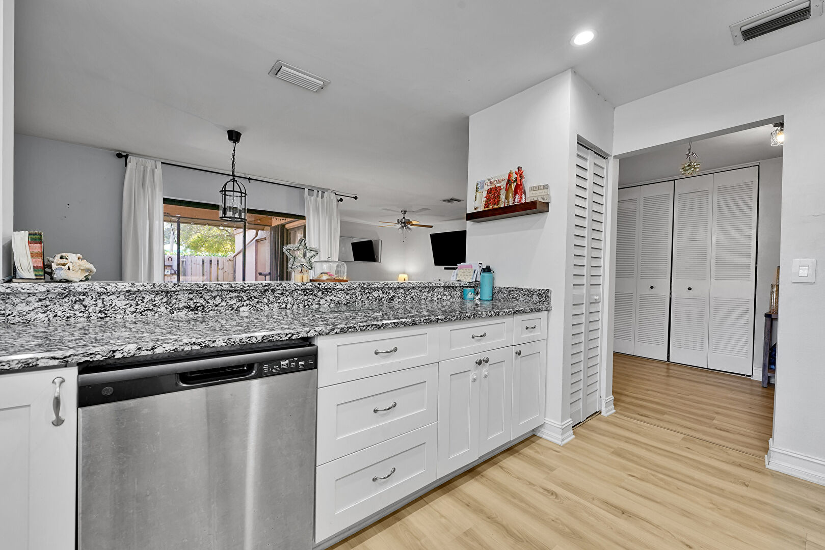 Baseboards Wall, Ceiling Fan, Crown Molding Cabinets, Drywall, Kitchen Peninsula, Natural Light, Open Shelves, Pass Through Window, Pendant Lighting, Recessed Lighting, Shaker Cabinets, Stone Countertops, Toaster, U Shaped Kitchen, Vent, Wood Finish Floor, Crown Molding Cabinets, Kitchen Peninsula, Shaker Cabinets