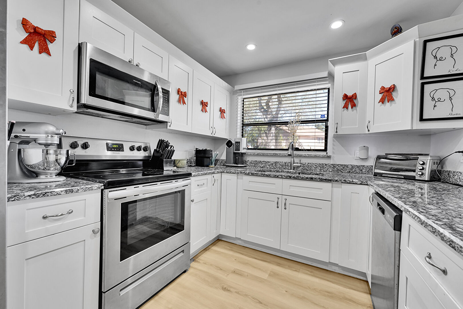 Baseboards Wall, Ceiling Fan, Drywall, Natural Light, Recessed Lighting, U Shaped Kitchen, Vent, Wood Finish Floor, Notable Chandelier, Wood Finish Floor