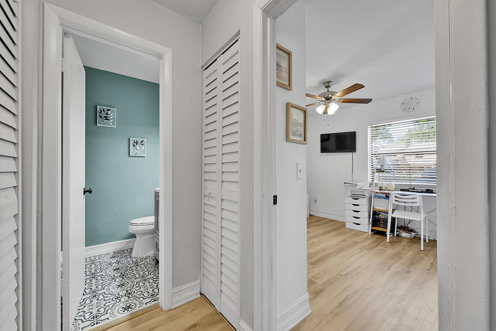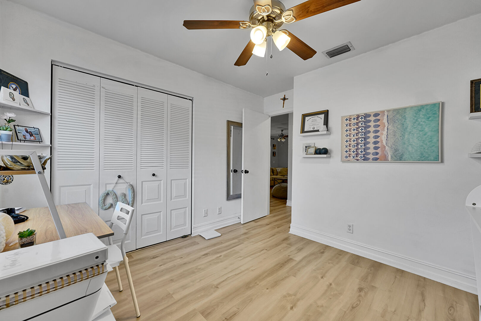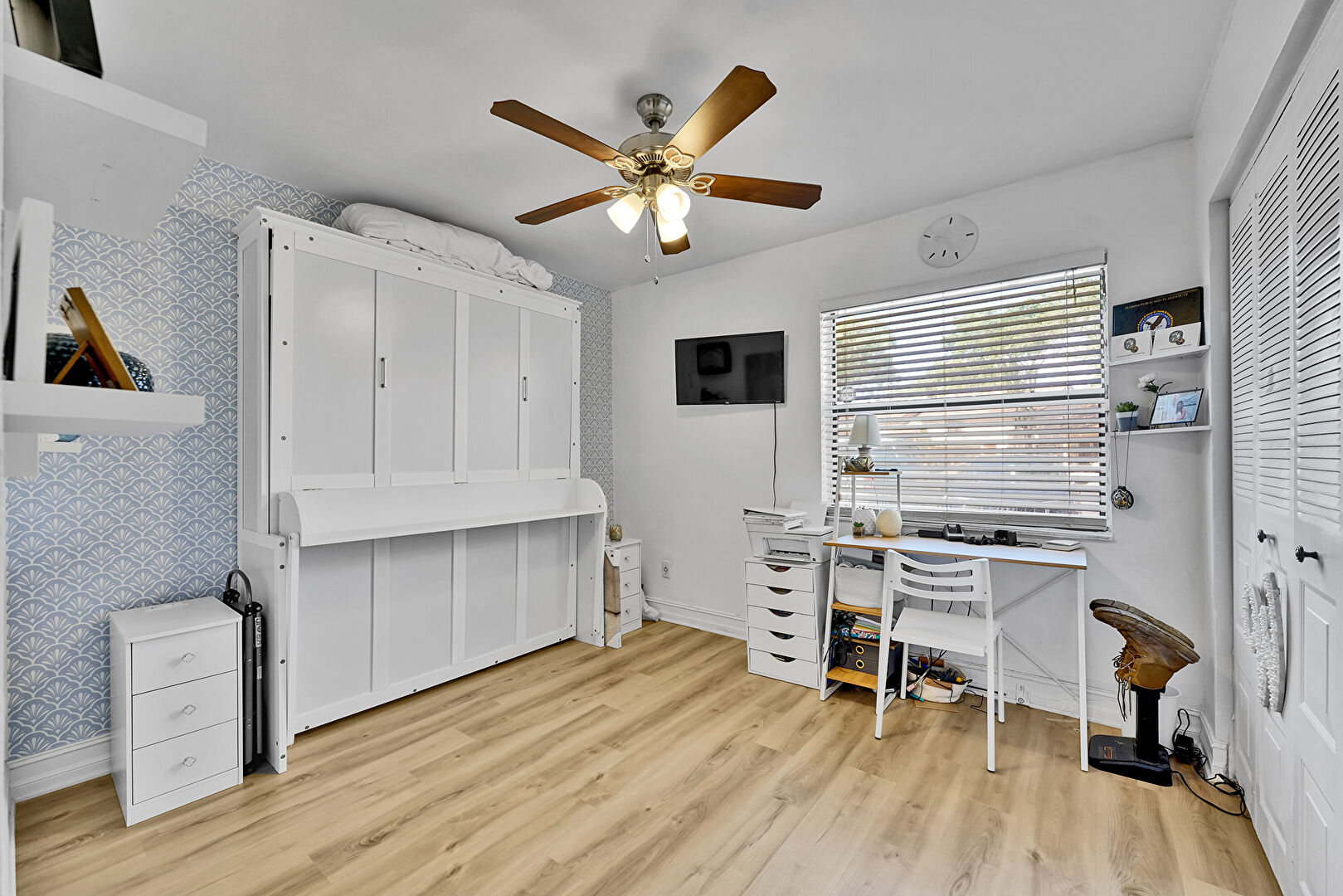 Baseboards Wall, Ceiling Fan, Drywall, Natural Light, Office Area, Vent, Wood Finish Floor, Drywall, Wallpaper Wall