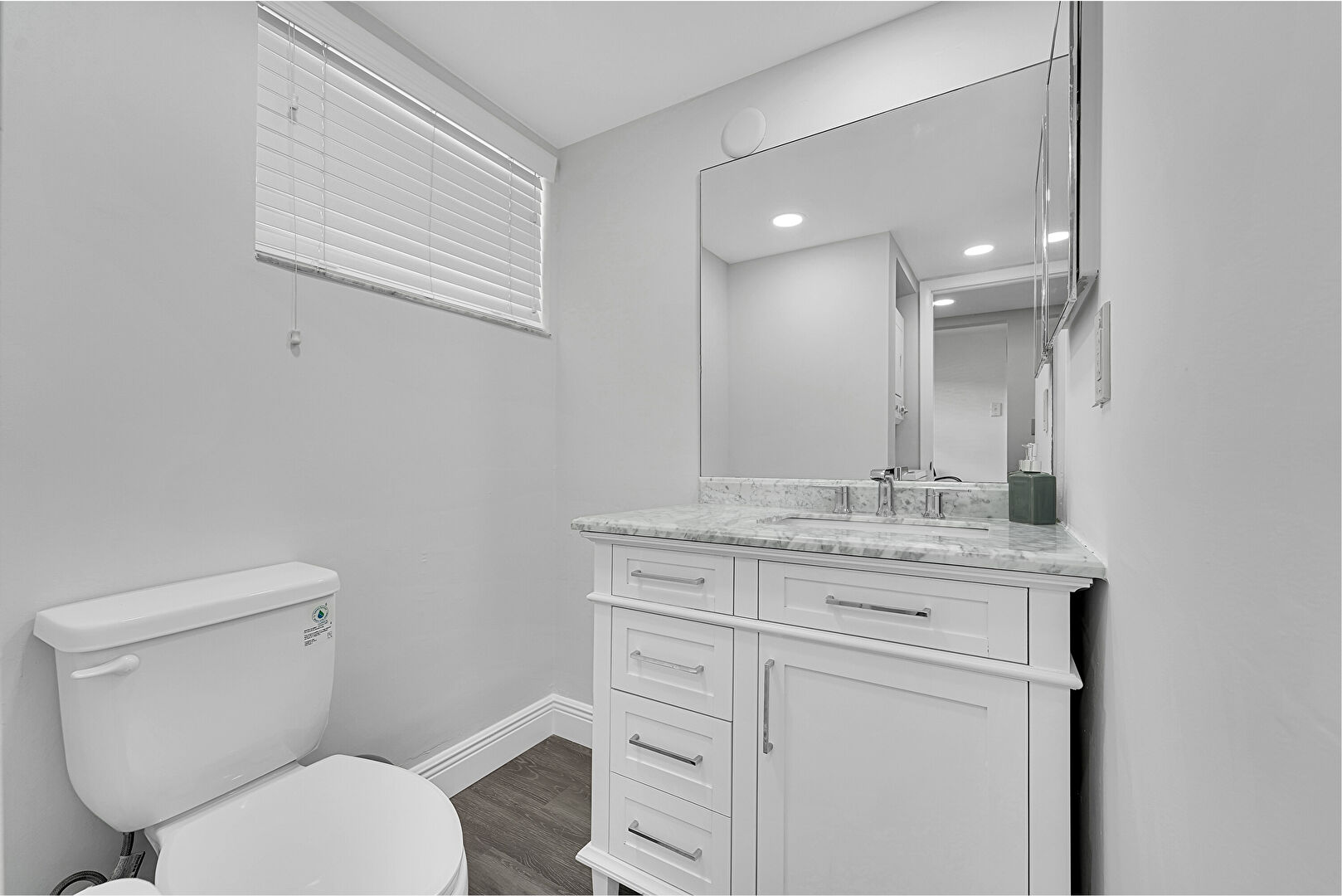 Baseboards Wall, Half Bathroom, Recessed Lighting, Vanity, Wood Finish Floor, Drywall