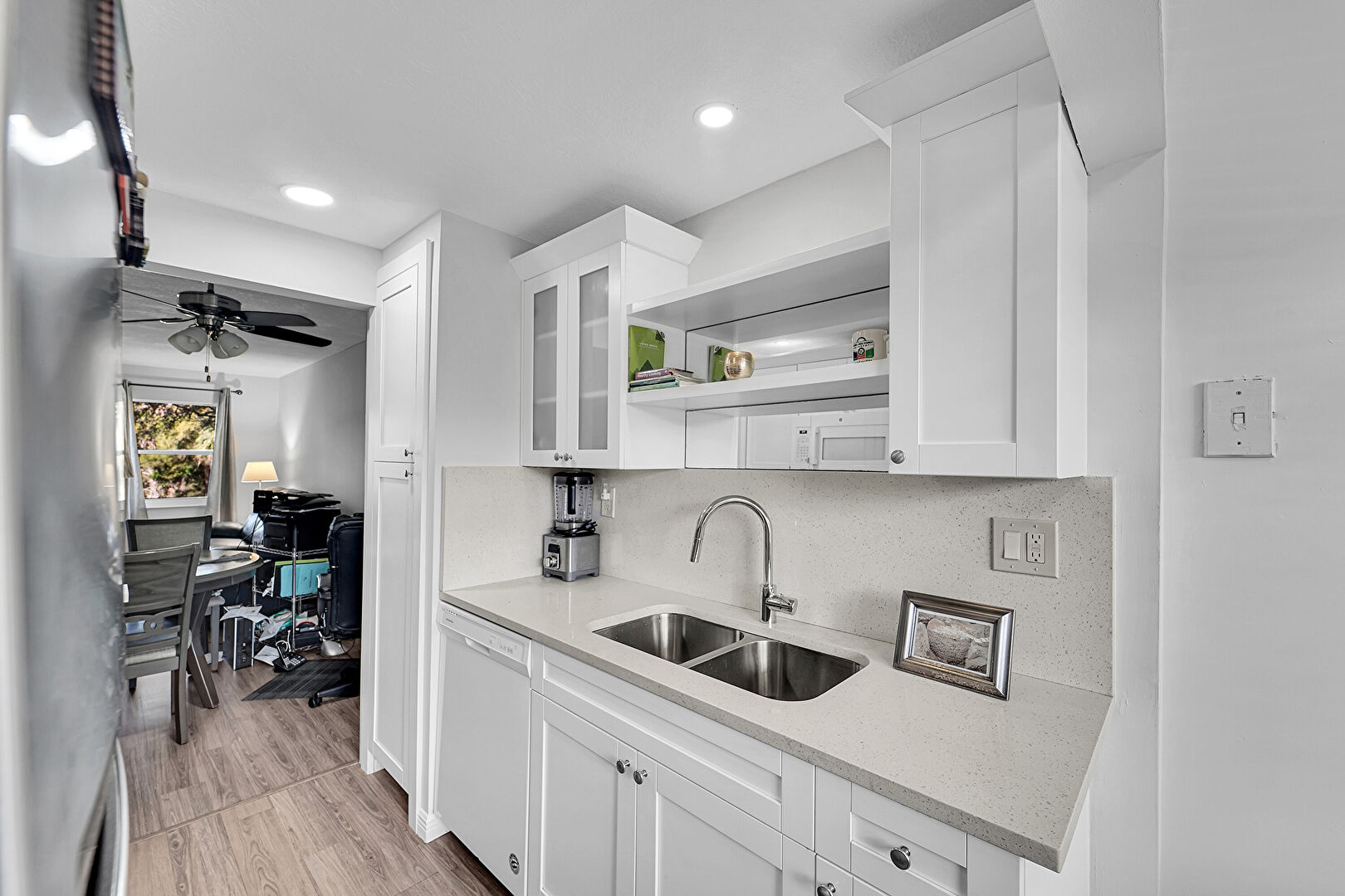 Baseboards Wall, Ceiling Fan, Crown Molding Cabinets, Drywall, Galley Kitchen, Glass Insert Cabinets, Natural Light, Open Shelves, Recessed Lighting, Shaker Cabinets, Stone Countertops, Wood Finish Floor, Crown Molding Cabinets, Natural Light, Wood Finish Floor