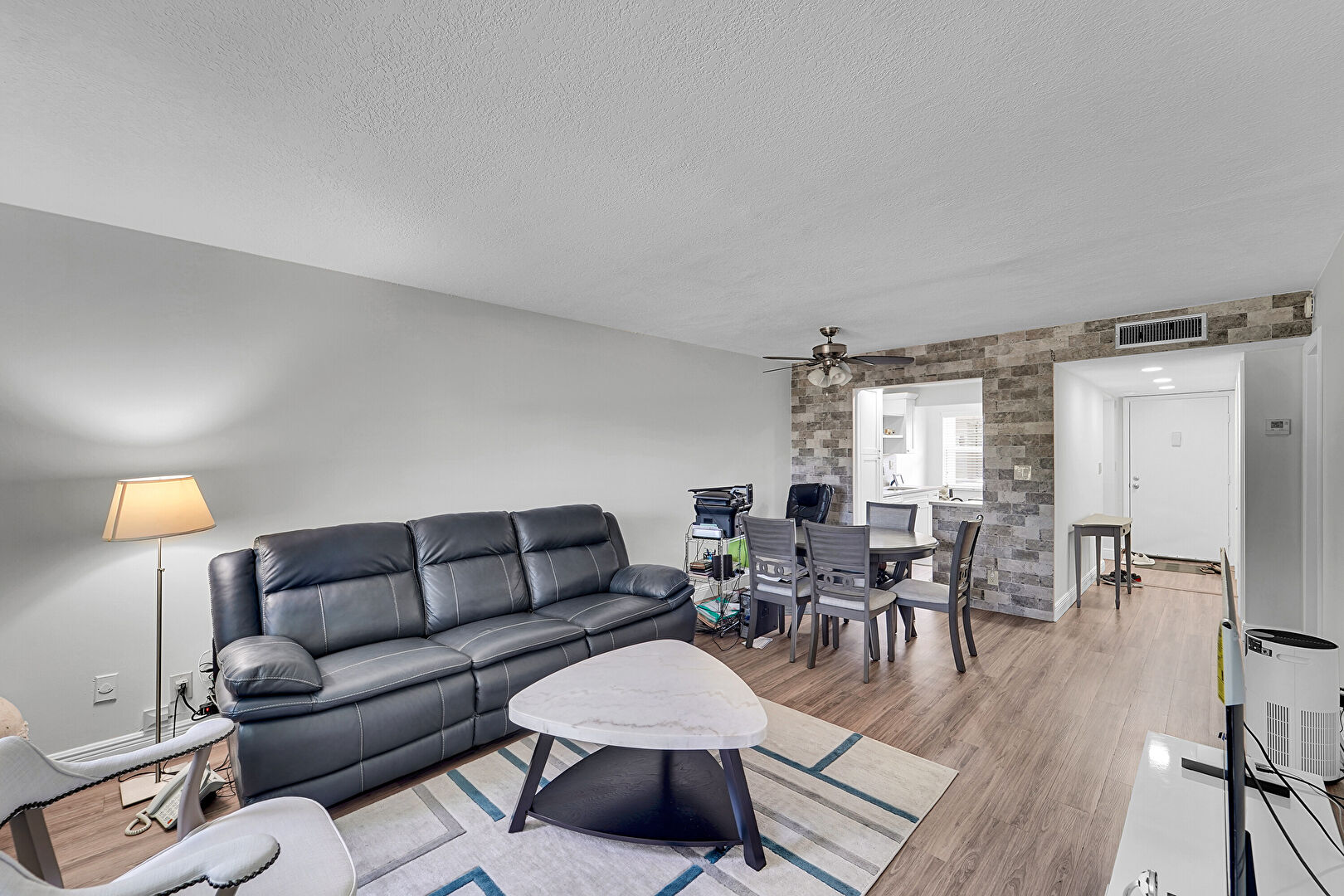 Baseboards Wall, Ceiling Fan, Drywall, Natural Light, Textured Ceiling, Vent, Wood Finish Floor, Ceiling Fan, Stone Wall