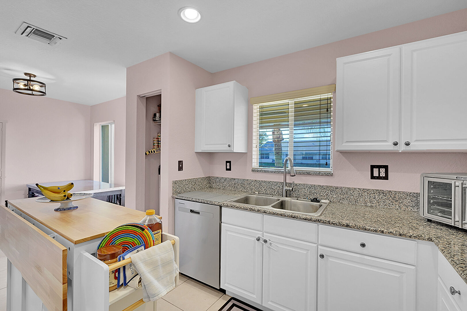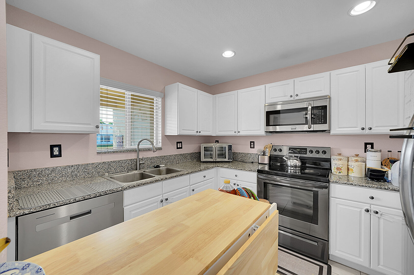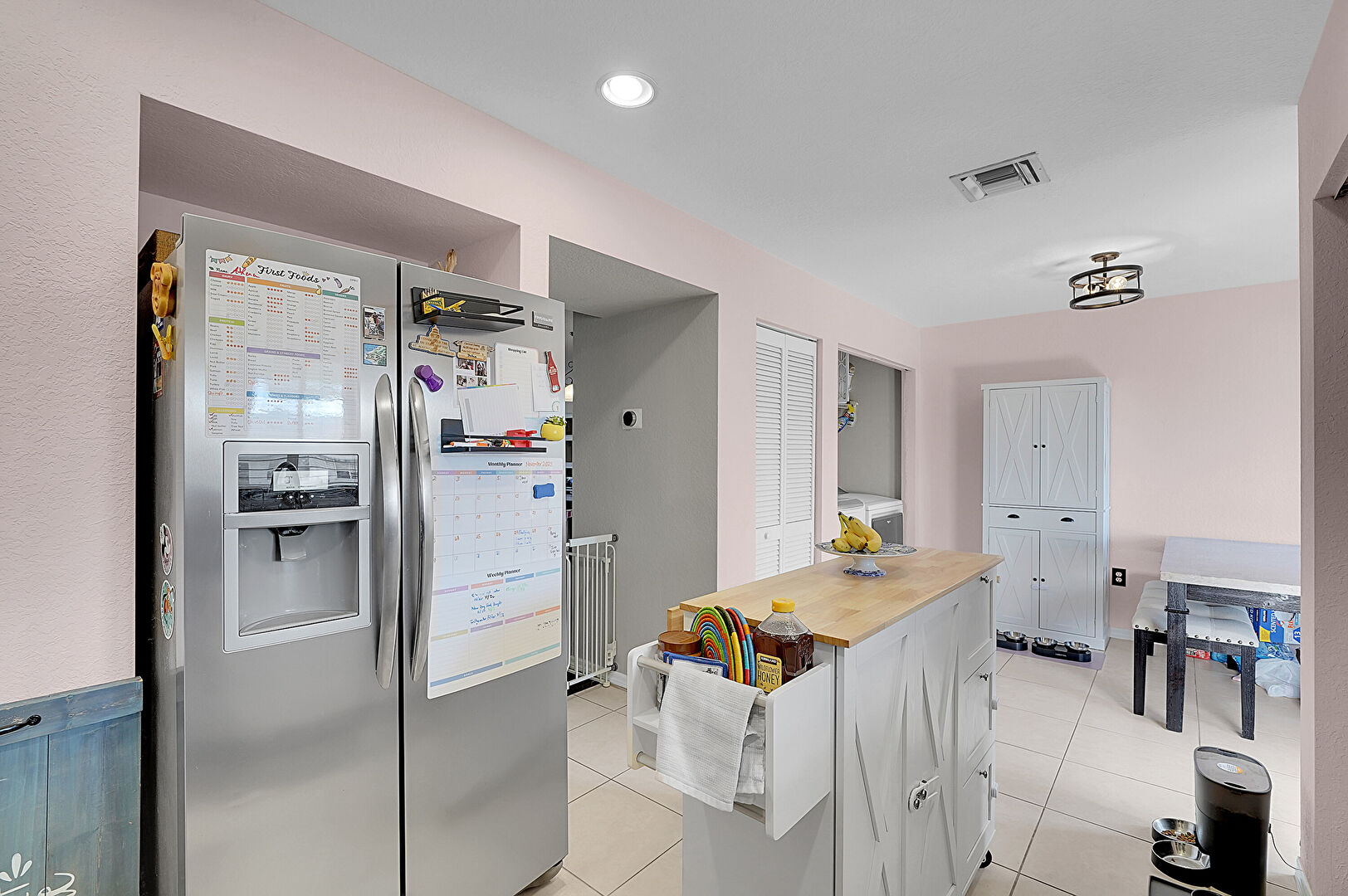 Butcher Block Countertops, Drywall, Kitchen Island, Laundry, Natural Light, Radiator, Raised Cabinets, Recessed Lighting, Shaker Cabinets, Stone Countertops, Tile Floor, Toaster, U Shaped Kitchen, Vent, Washer Dryer, Baseboards Wall, Drywall, Tile Floor