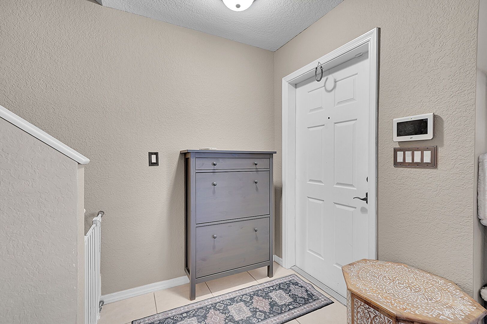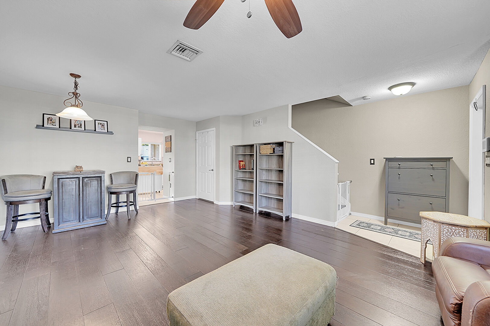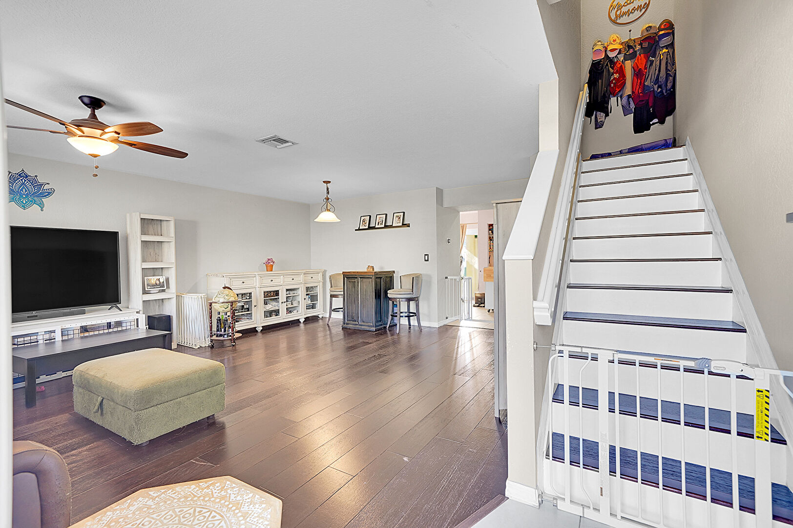 Baseboards Wall, Ceiling Fan, Stairs, Textured Wall, Tile Floor, Vent, Wood Finish Floor, Drywall, Textured Ceiling