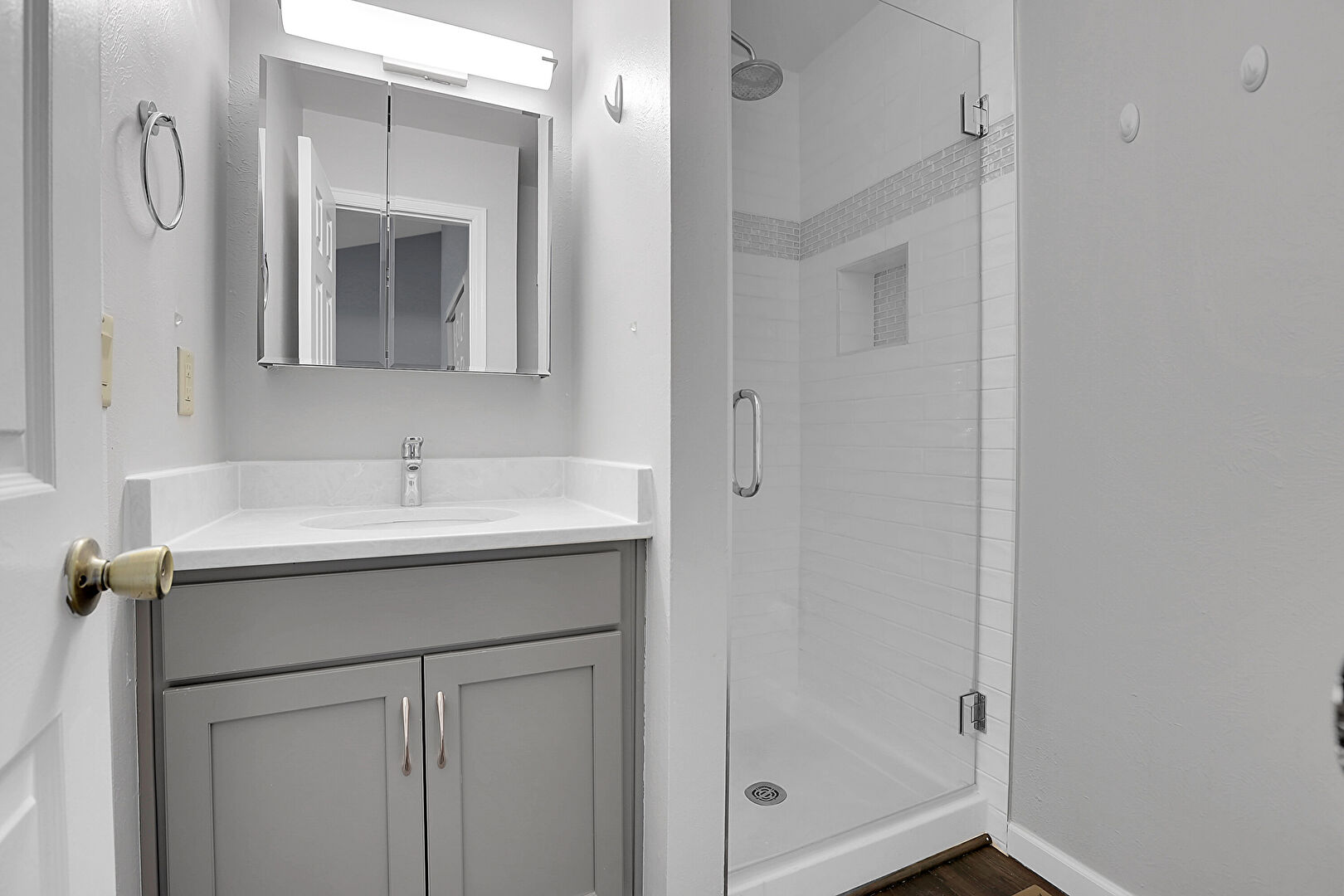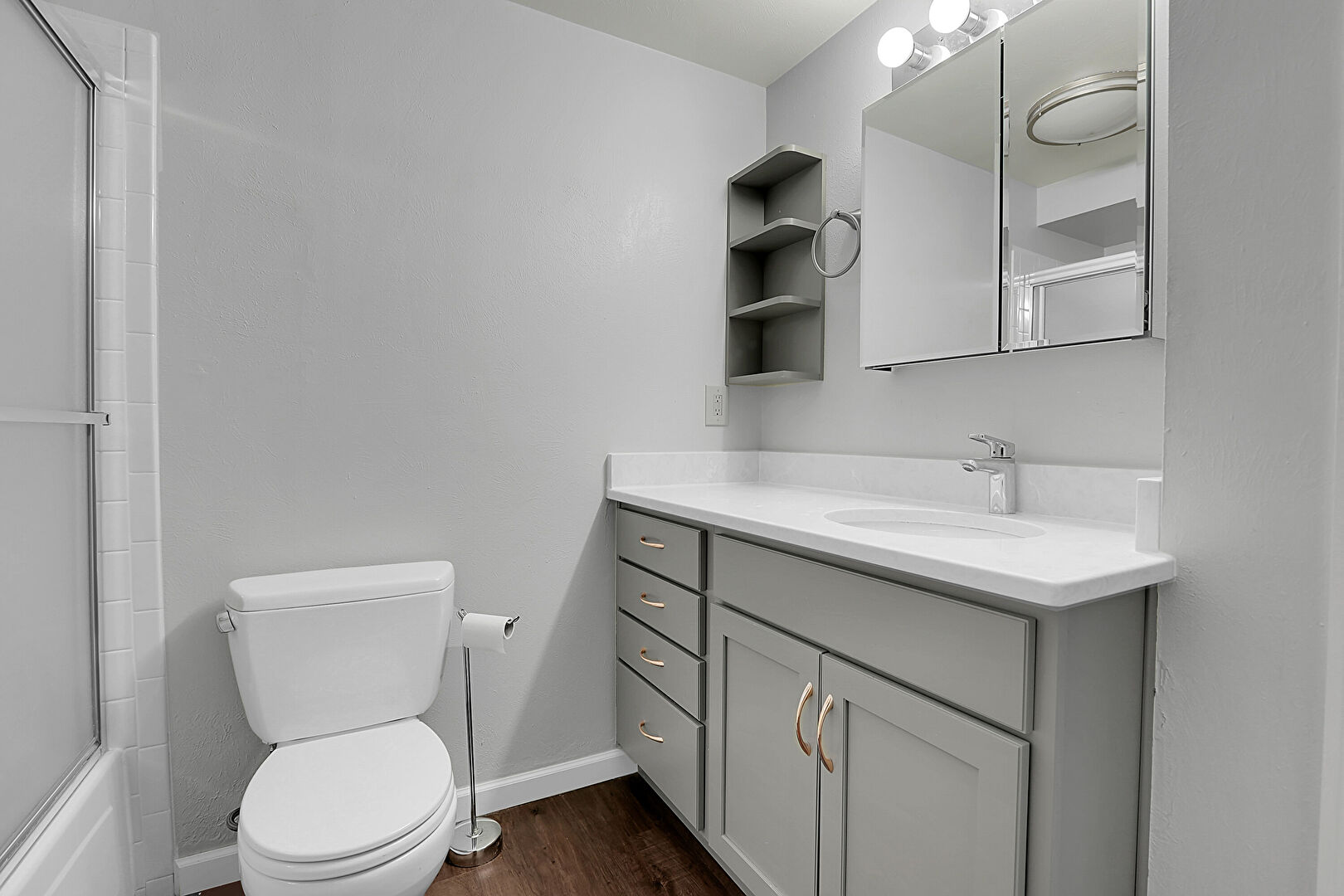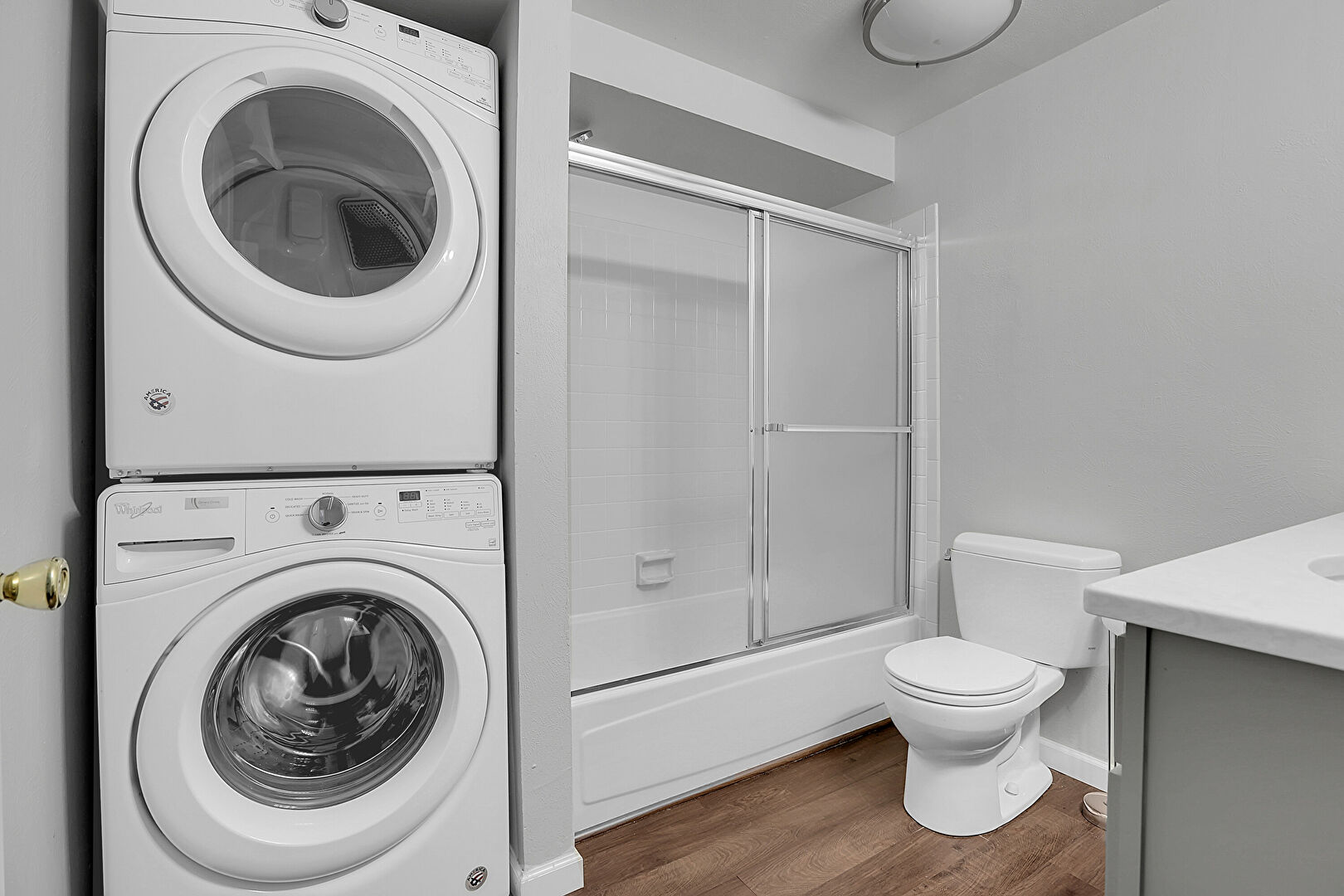Baseboards Wall, Combined Bath Shower, Drywall, Full Bathroom, Laundry, Vanity, Wood Finish Floor, Drywall, Vanity