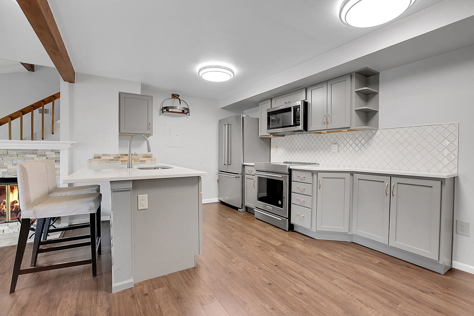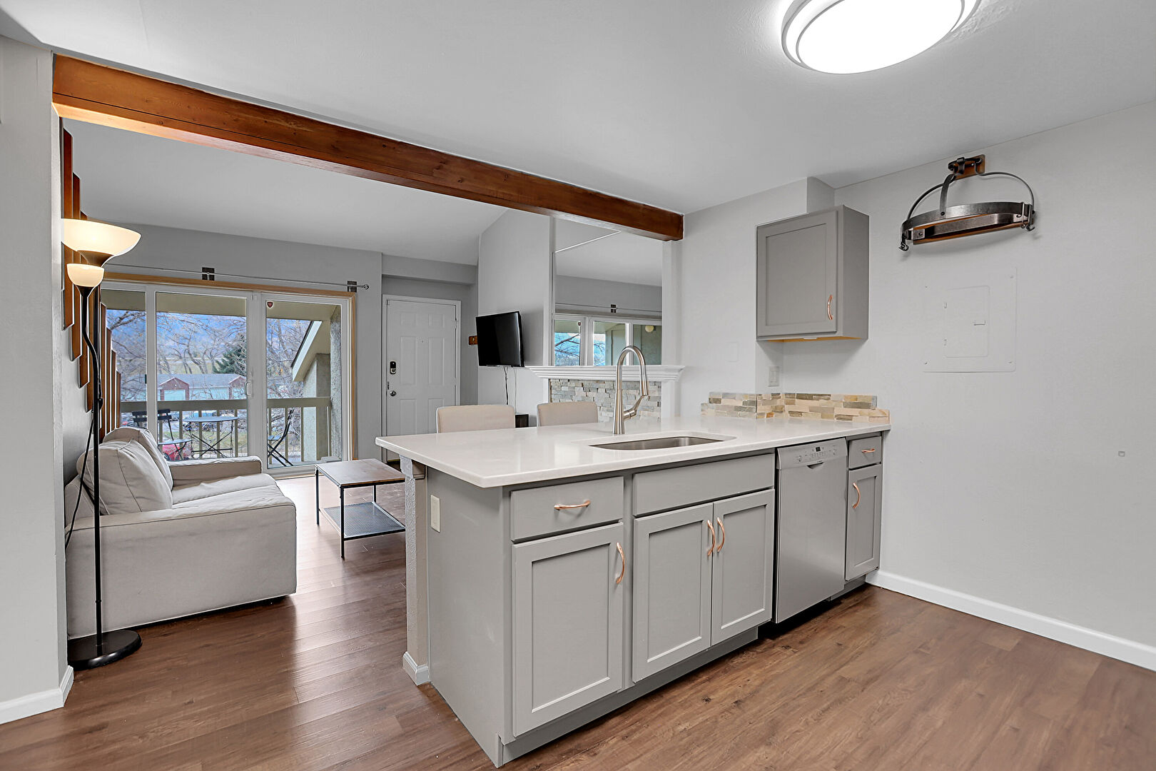 Baseboards Wall, Beamed Ceiling, Drywall, Electric Panel, Galley Kitchen, Gray Cabinets, Kitchen Bar, Kitchen Peninsula, Open Shelves, Opens To Living Area, Shaker Cabinets, Stone Countertops, Wood Finish Floor, Gray Cabinets, Natural Light, Wood Finish Floor