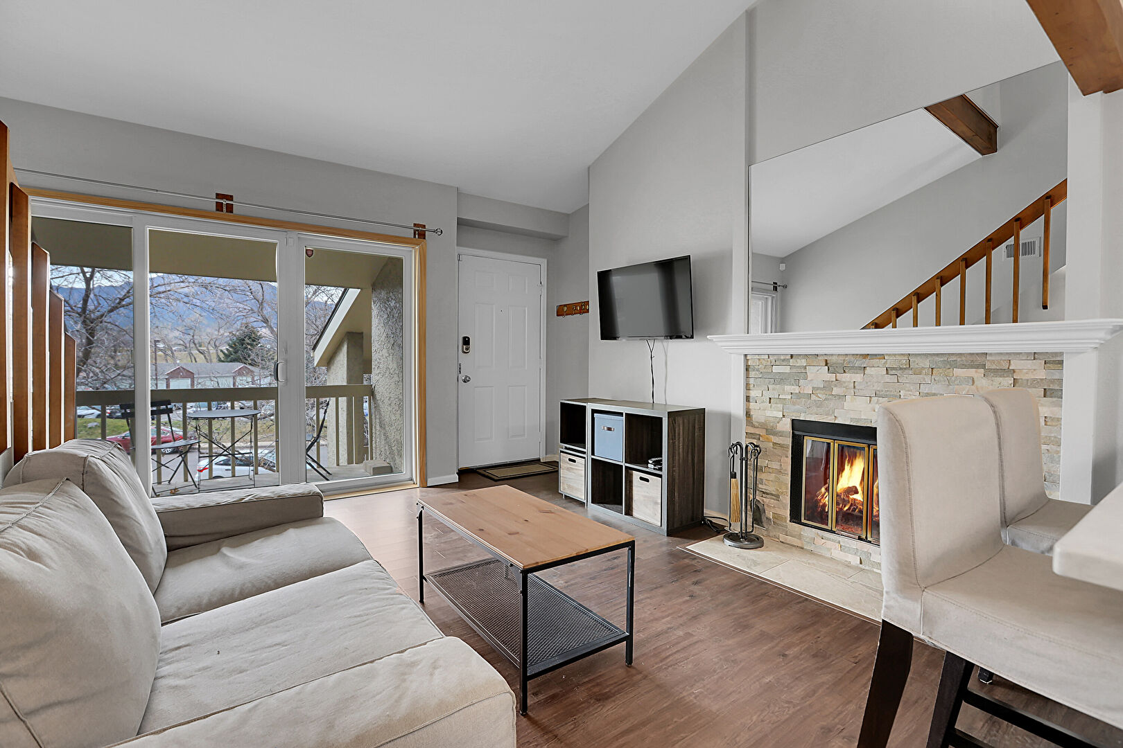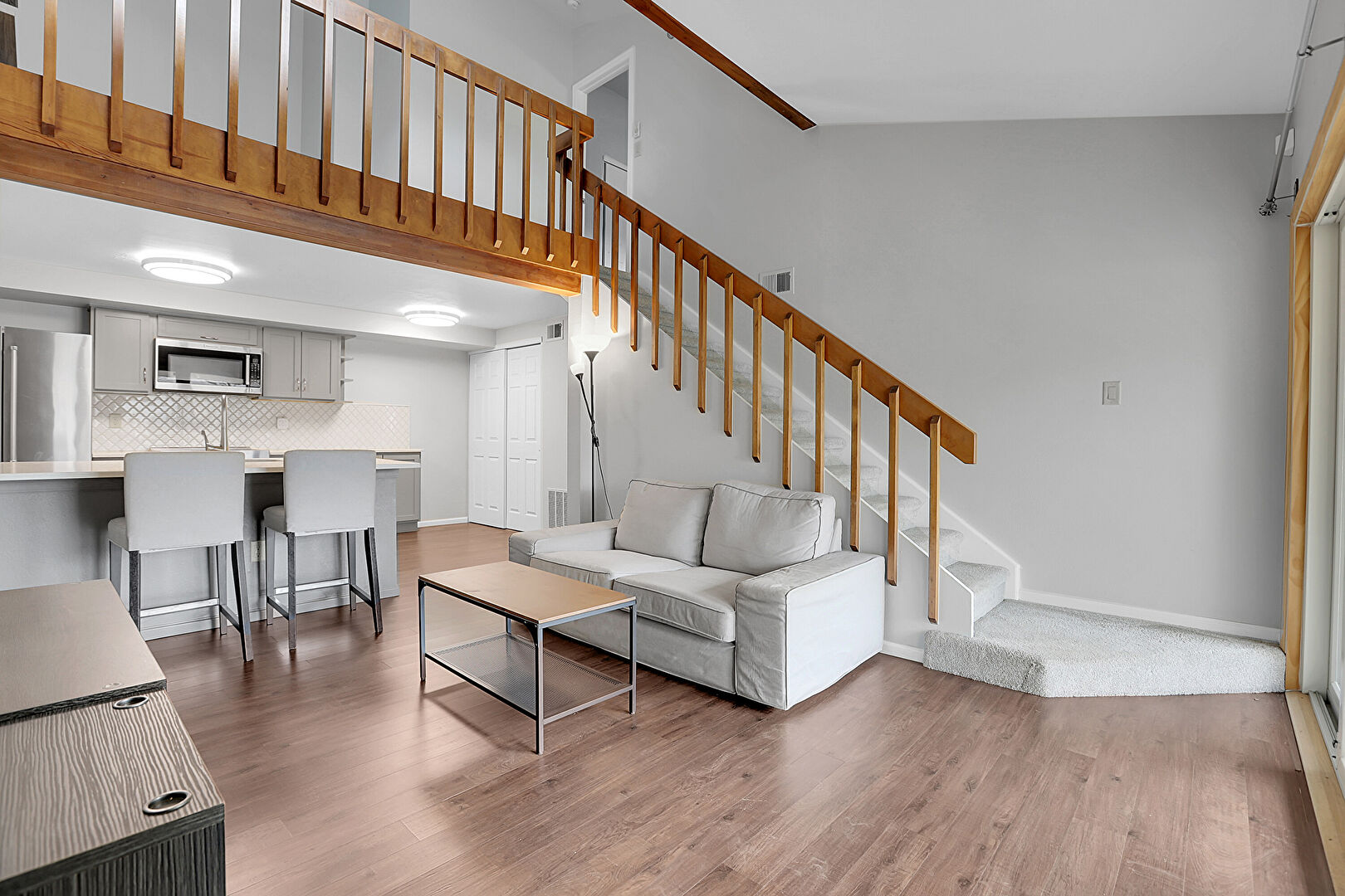 Baseboards Wall, Beamed Ceiling, Ceiling Fan, Drywall, Fireplace, G Shaped Kitchen, High Ceiling, Natural Light, Stairs, U Shaped Kitchen, Vaulted Ceiling, Vent, Wood Finish Floor, Baseboards Wall, High Ceiling