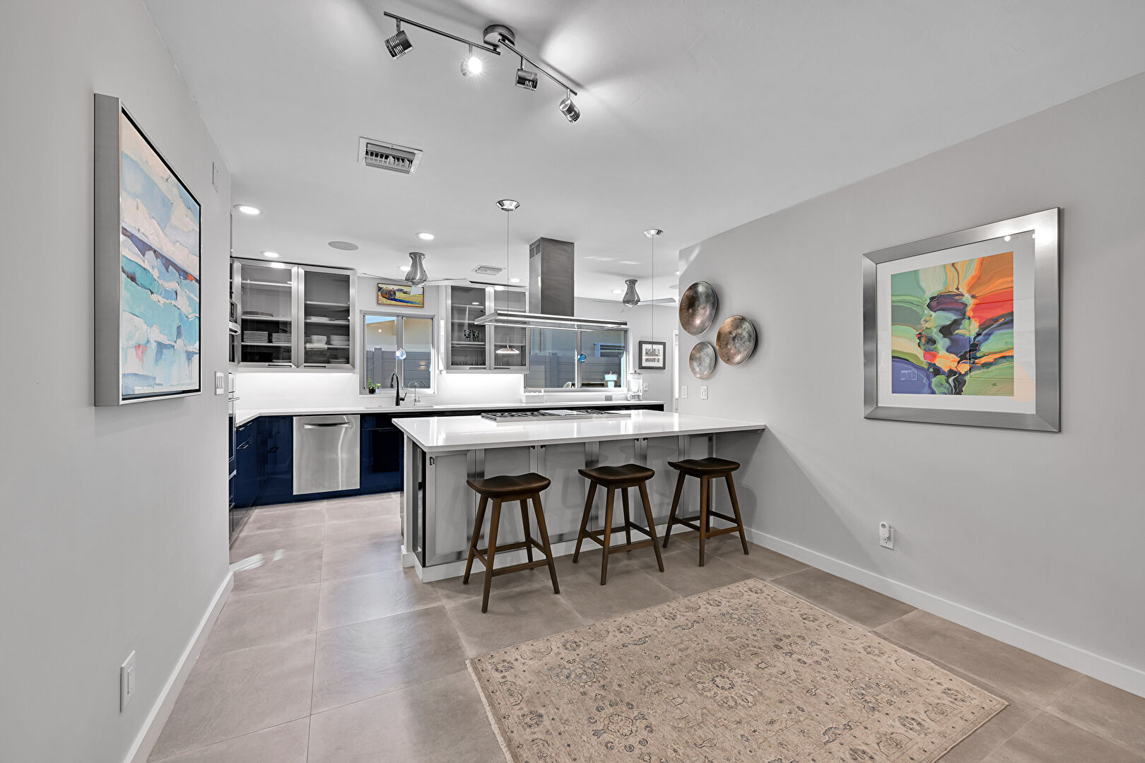 Baseboards Wall, Blue Cabinets, Ceiling Fan, Double Oven, Drywall, Flat Panel Cabinets, Glass Insert Cabinets, Kitchen Bar, Kitchen Island, Kitchen Peninsula, Natural Light, Open Shelves, Opens To Living Area, Pendant Lighting, Recessed Lighting, Stone Countertops, Tile Floor, Toaster, Track Lighting, U Shaped Kitchen, Vent, Drywall, Flat Panel Cabinets, Gray Cabinets, Pendant Lighting, Recessed Lighting, Tile Floor, Vent