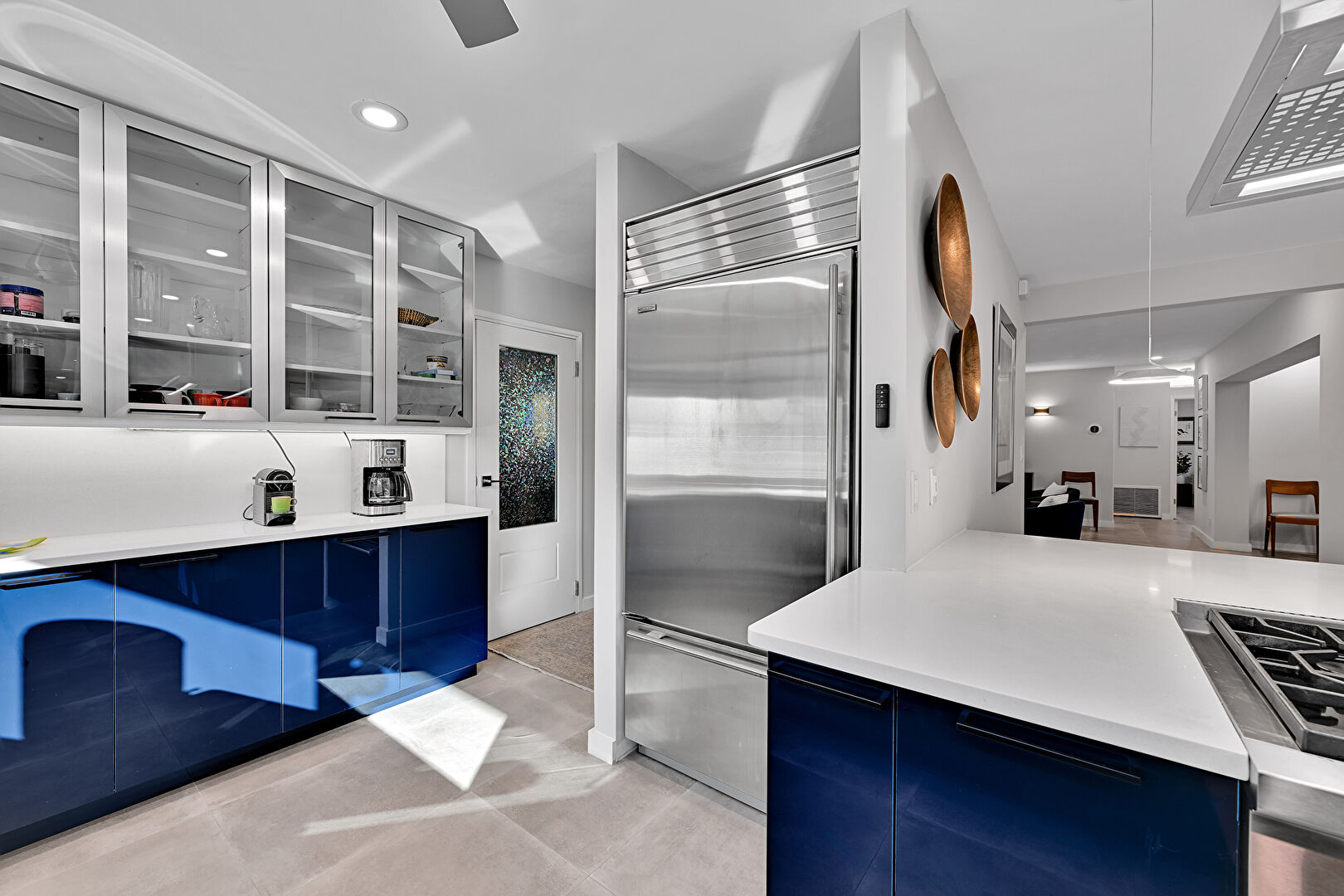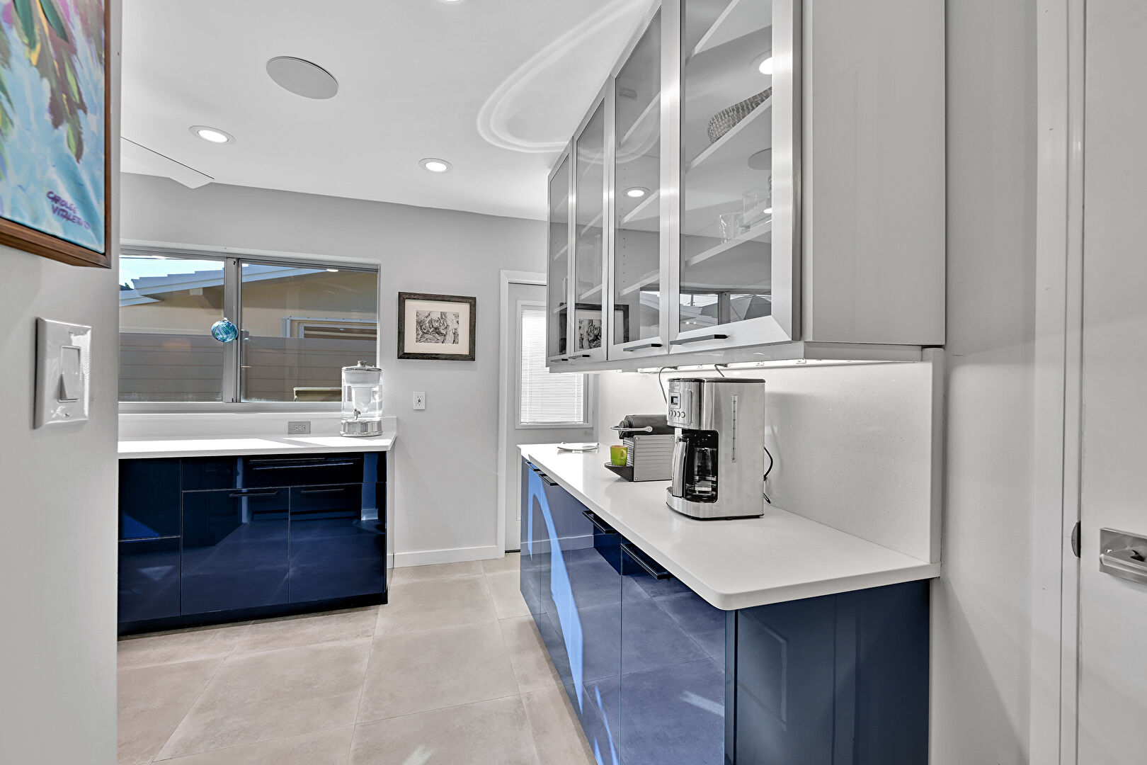 Baseboards Wall, Blue Cabinets, Drywall, Flat Panel Cabinets, Glass Insert Cabinets, Gray Cabinets, Natural Light, Recessed Lighting, Stone Countertops, Tile Floor, Glass Insert Cabinets, Tile Floor
