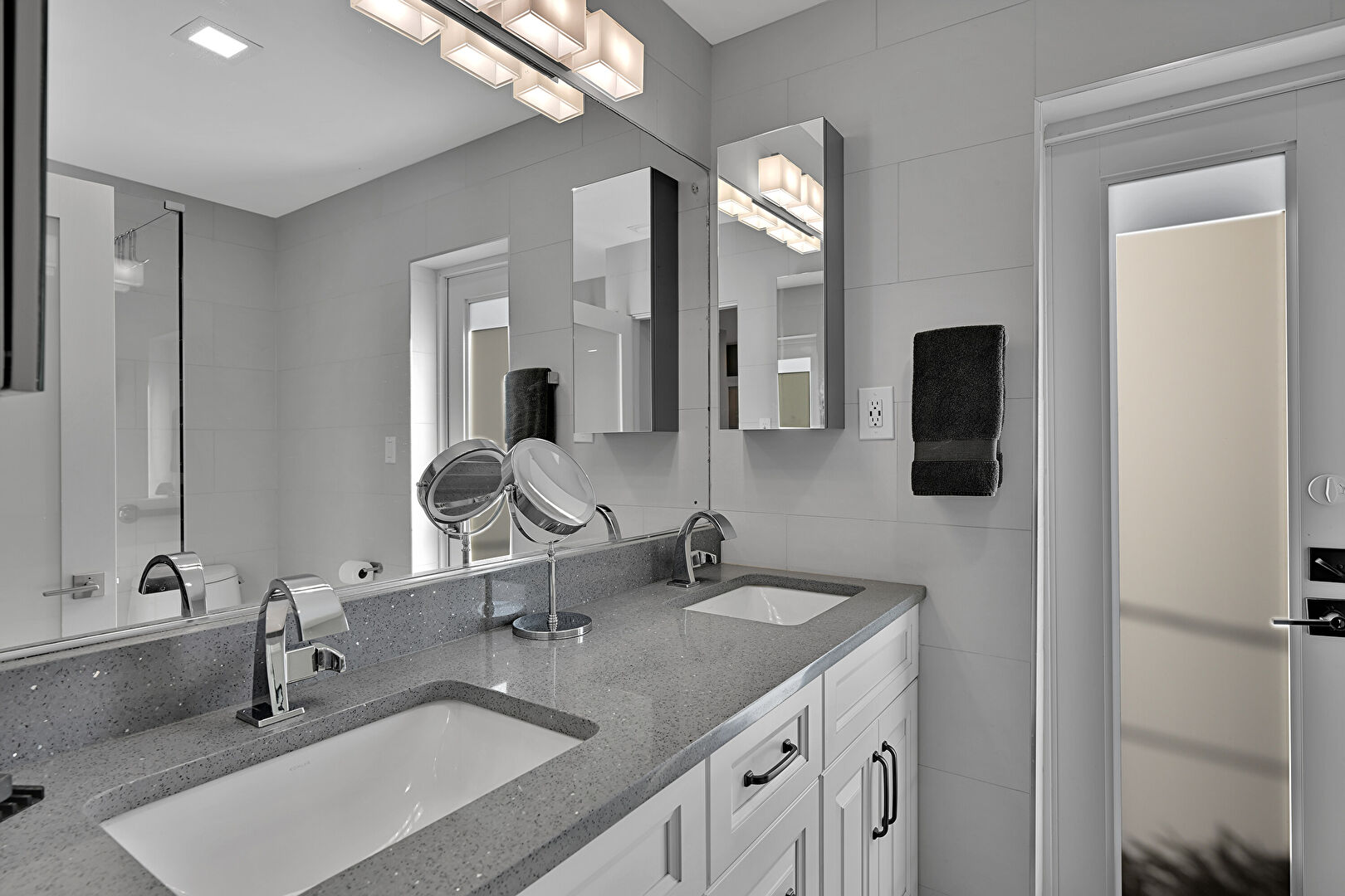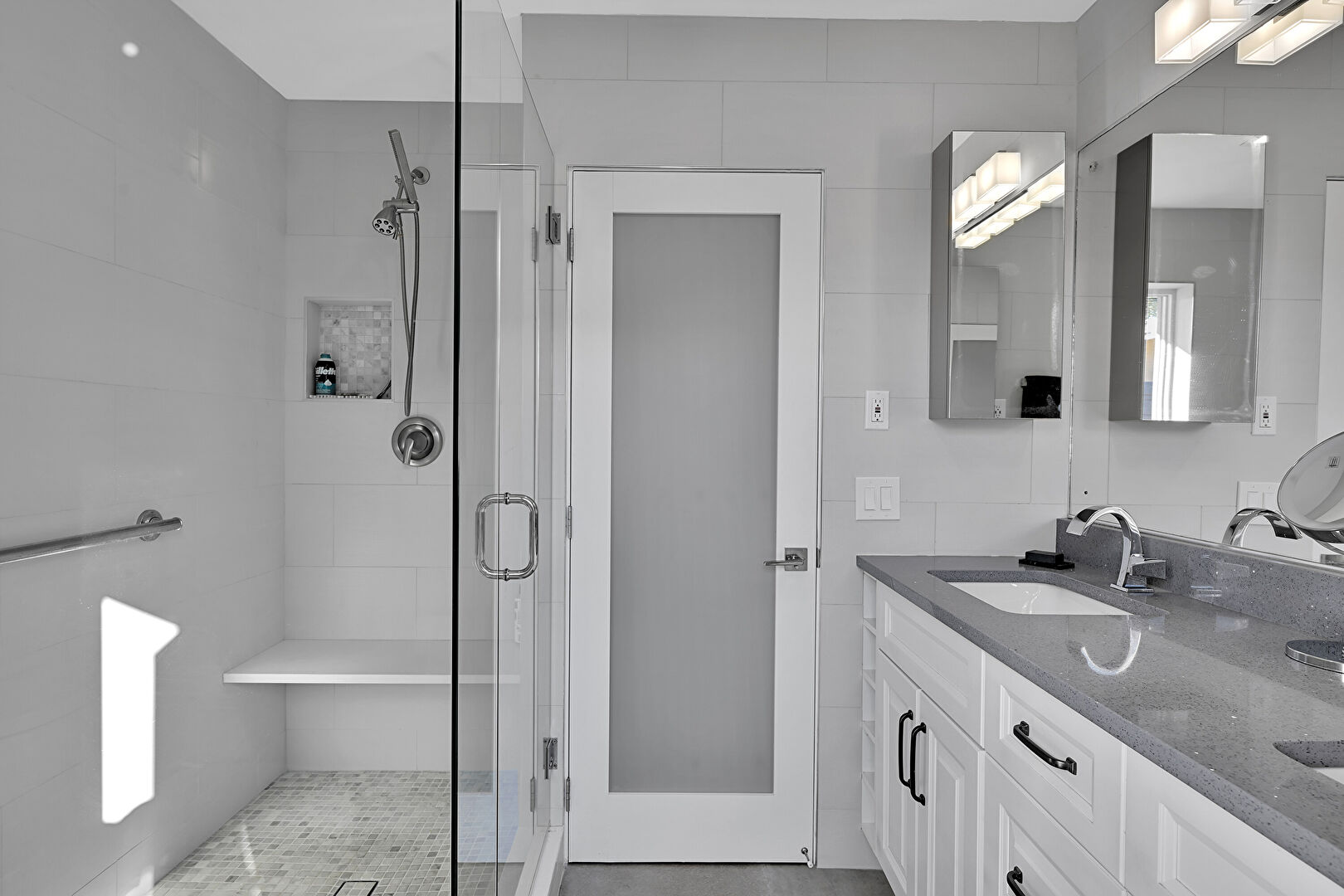 Ceiling Fan, Combined Bath Shower, Double Vanity, Drywall, Full Bathroom, Natural Light, Tile Floor, Tile Wall, Vanity, Vent, Drywall, Ensuite Bathroom, Full Bathroom, Natural Light, Tile Wall