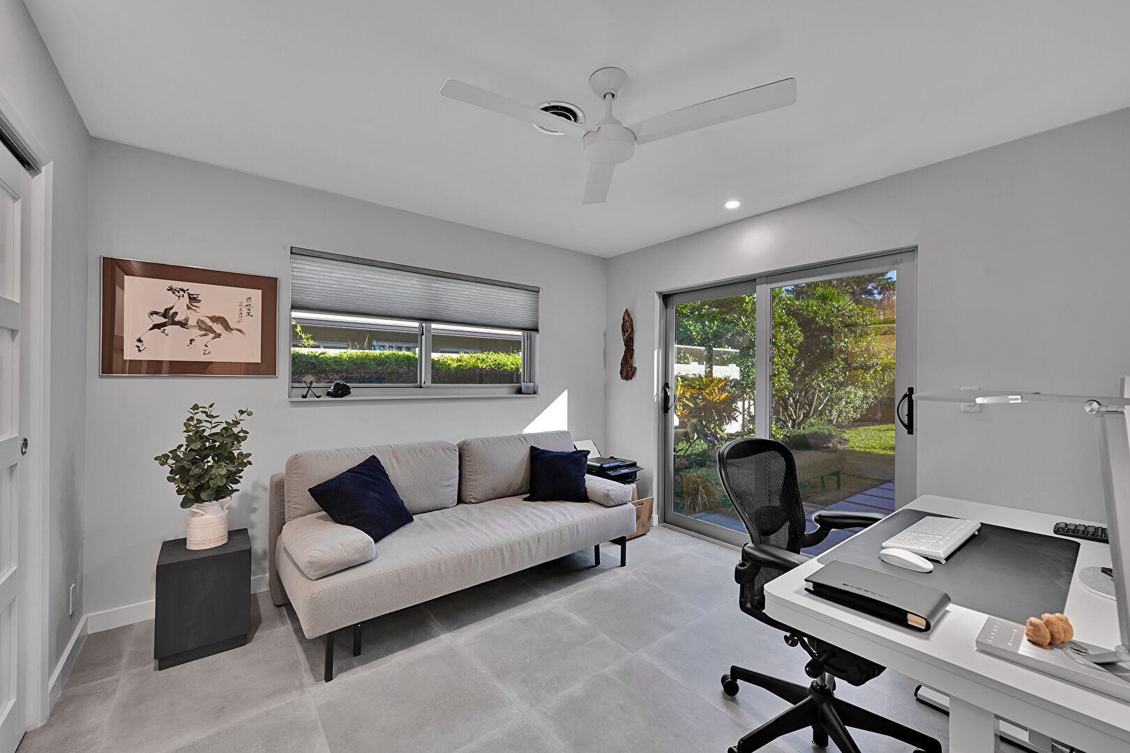 Baseboards Wall, Ceiling Fan, Drywall, French Doors, Natural Light, Office Area, Recessed Lighting, Tile Floor, Vent, Wood Finish Floor, Ceiling Fan, Drywall, Office Area, Recessed Lighting