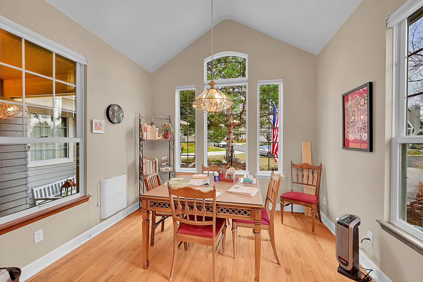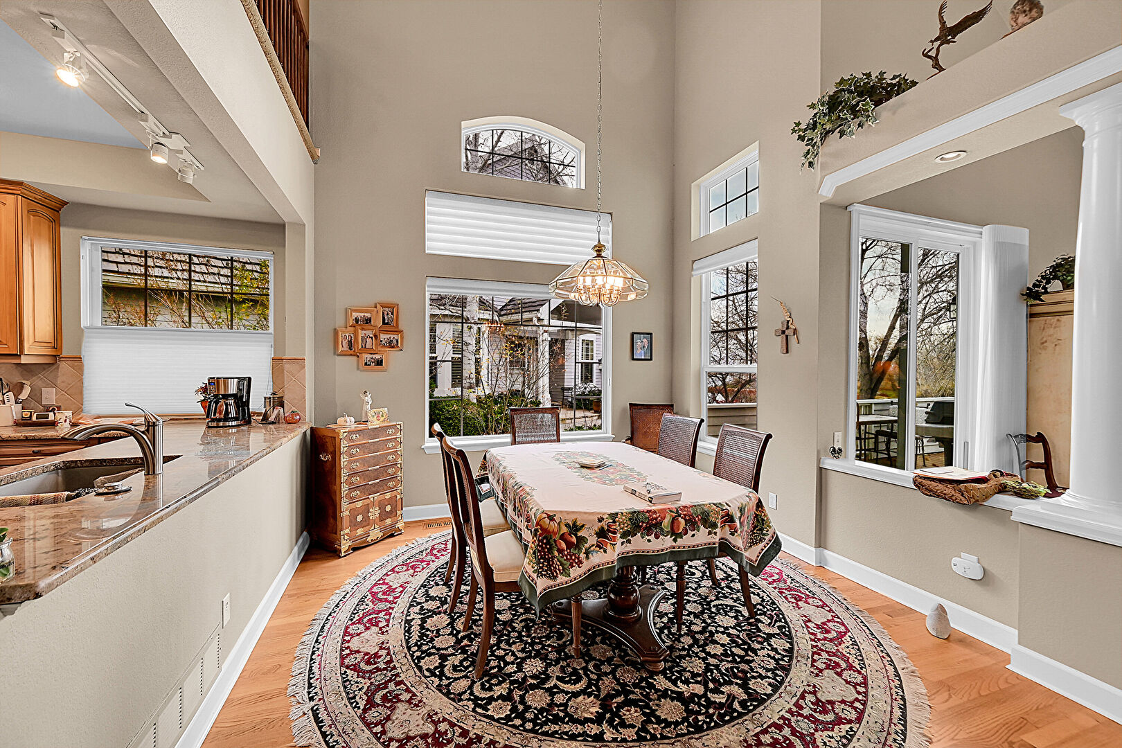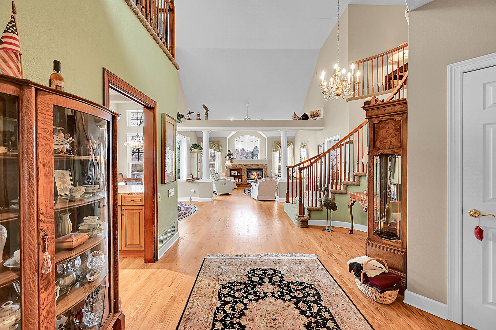 Baseboards Wall, Cathedral Ceiling, Decorative Columns, Drywall, High Ceiling, Natural Light, Notable Chandelier, Track Lighting, Vaulted Ceiling, Vent, Wood Finish Floor, Drywall, Natural Light