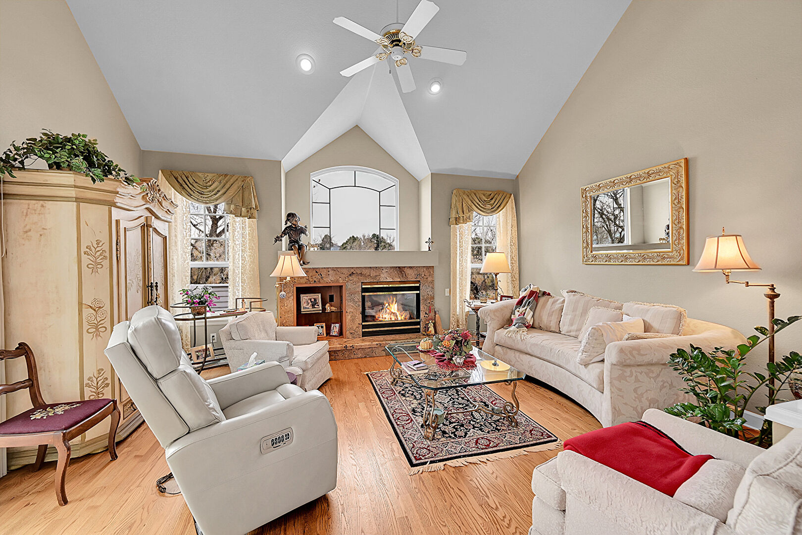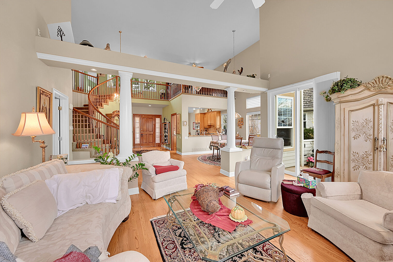 Baseboards Wall, Ceiling Fan, Decorative Columns, Double Oven, Drywall, Fireplace, High Ceiling, Natural Light, Stairs, Vaulted Ceiling, Vent, Wood Finish Floor, Notable Chandelier, Stairs