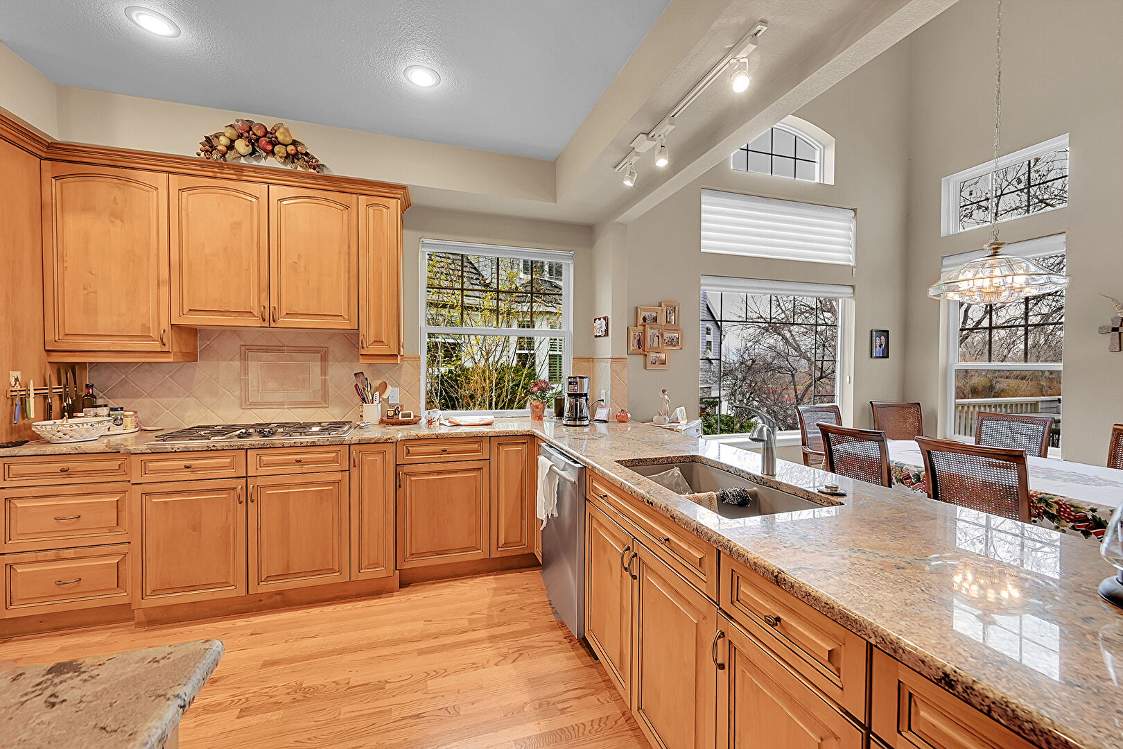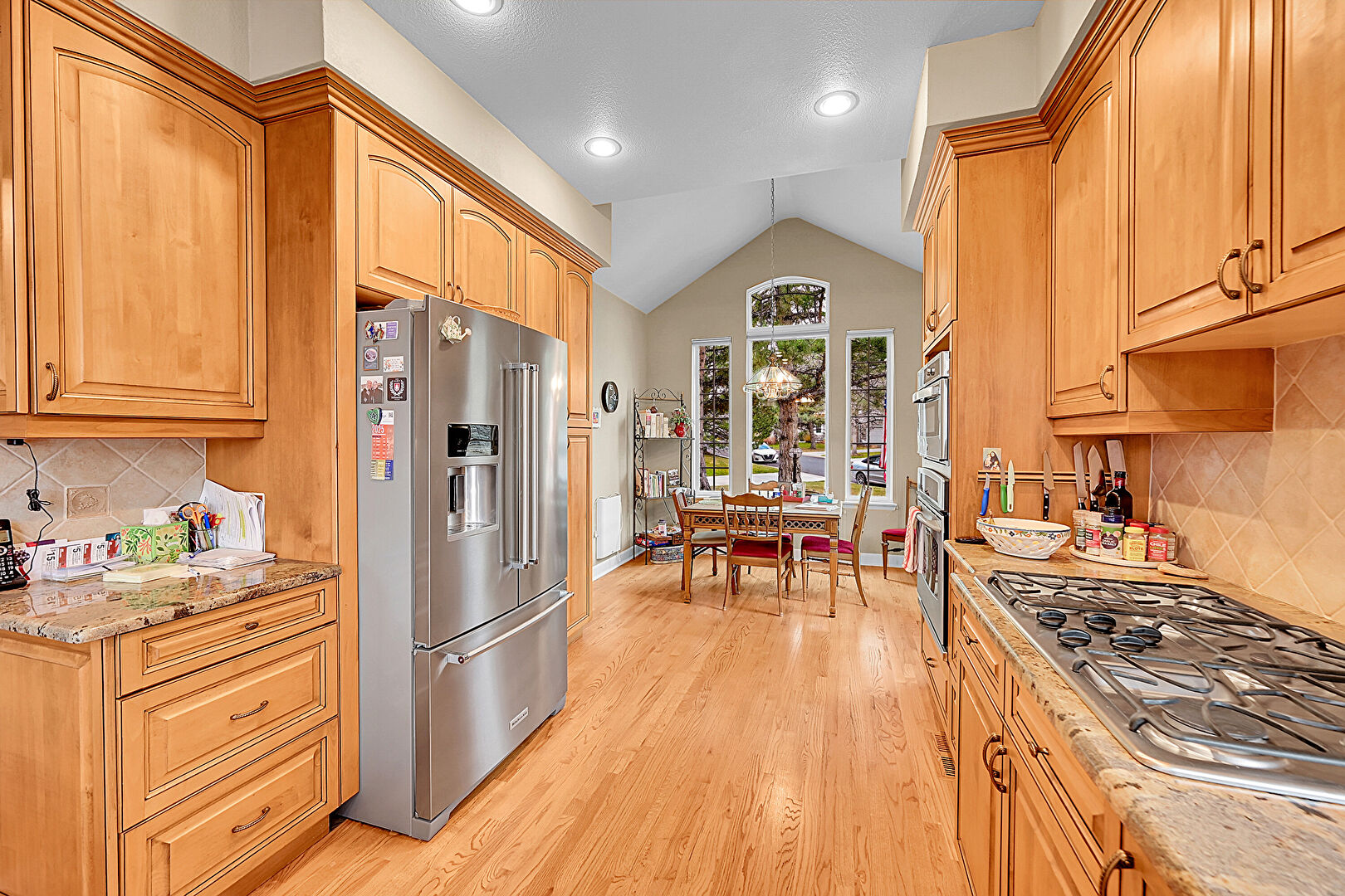 Arched Cabinets, Cathedral Ceiling, Crown Molding Cabinets, Double Oven, Drywall, High Ceiling, Kitchen Peninsula, Medium Brown Cabinets, Natural Light, Notable Chandelier, Pass Through Window, Pendant Lighting, Raised Cabinets, Recessed Lighting, Stone Countertops, Track Lighting, Vaulted Ceiling, Wood Finish Floor, Drywall, Kitchen Peninsula, Wood Finish Floor