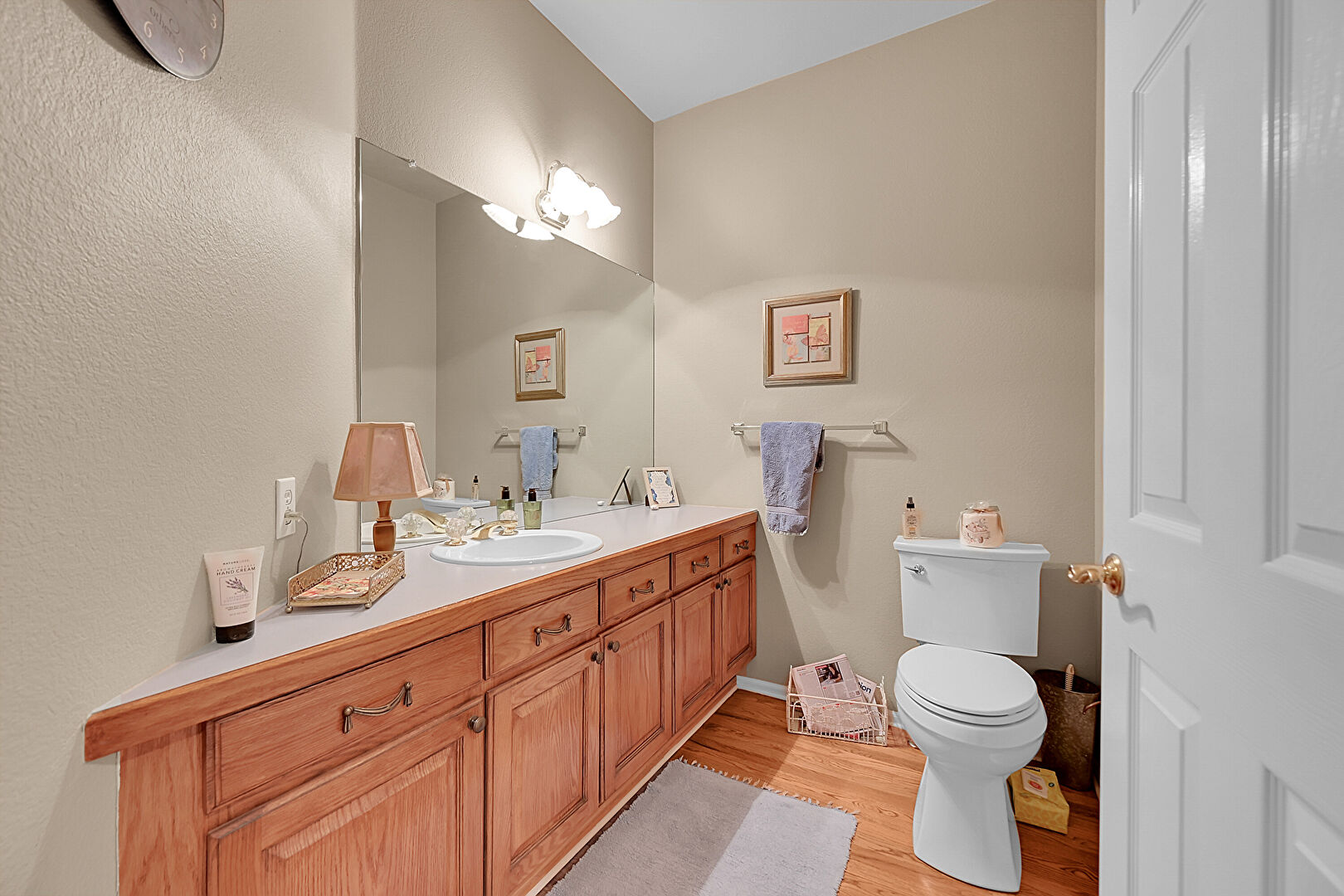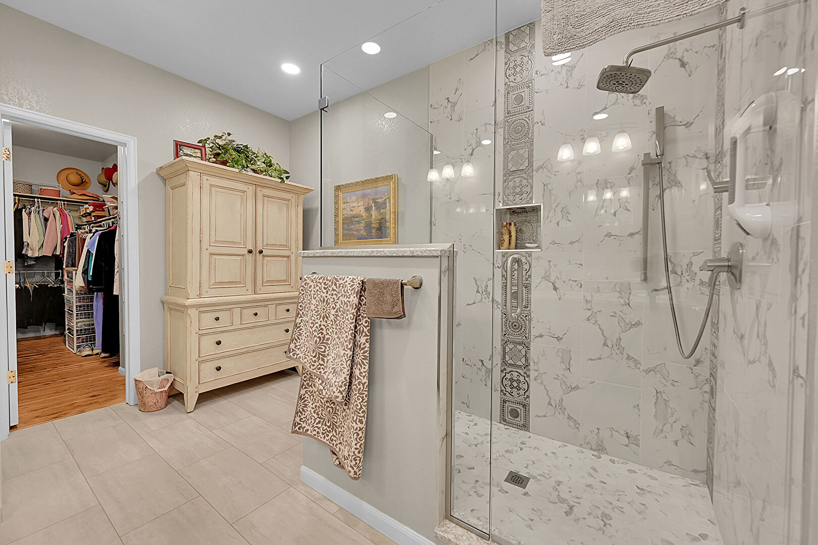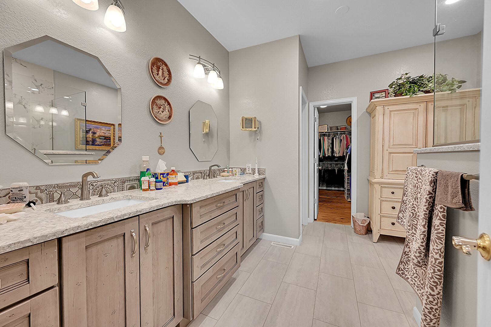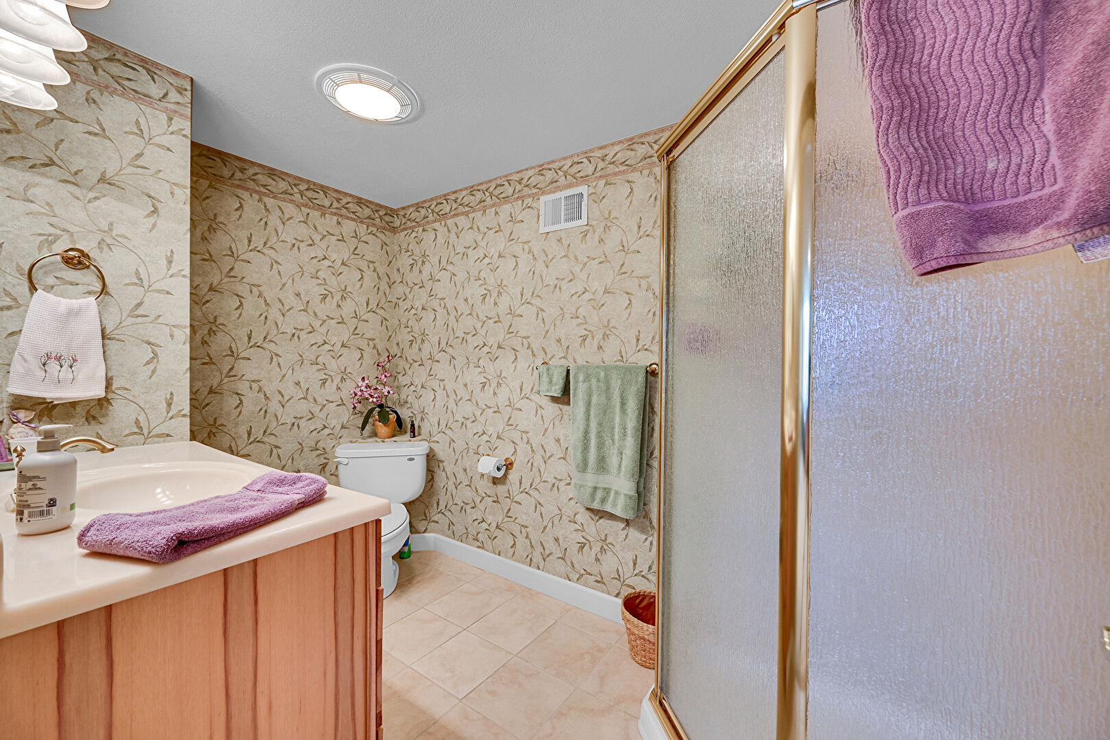Baseboards Wall, Combined Bath Shower, Drywall, Full Bathroom, Half Bathroom, Textured Wall, Tile Floor, Vanity, Walk In Closet, Wallpaper Wall, Wood Finish Floor, Double Vanity, Recessed Lighting, Vanity, Vent, Vinyl Floor
