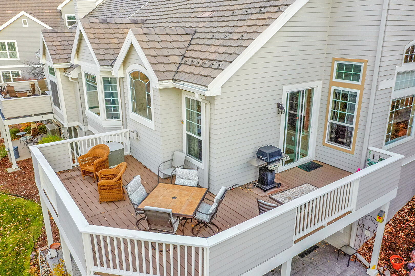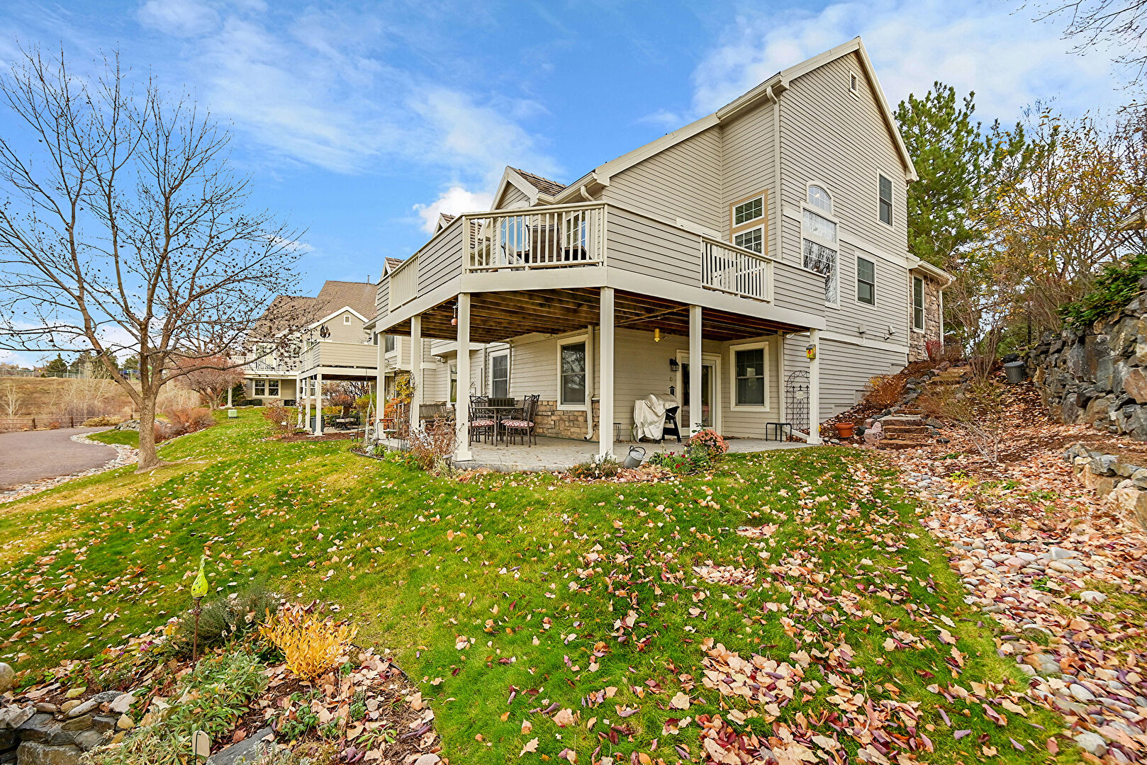 Basement Walk Out, Deck, Downspout, Gutters, Horizontal Siding, Lawn, Patio, Basement Walk Out, Stone Siding