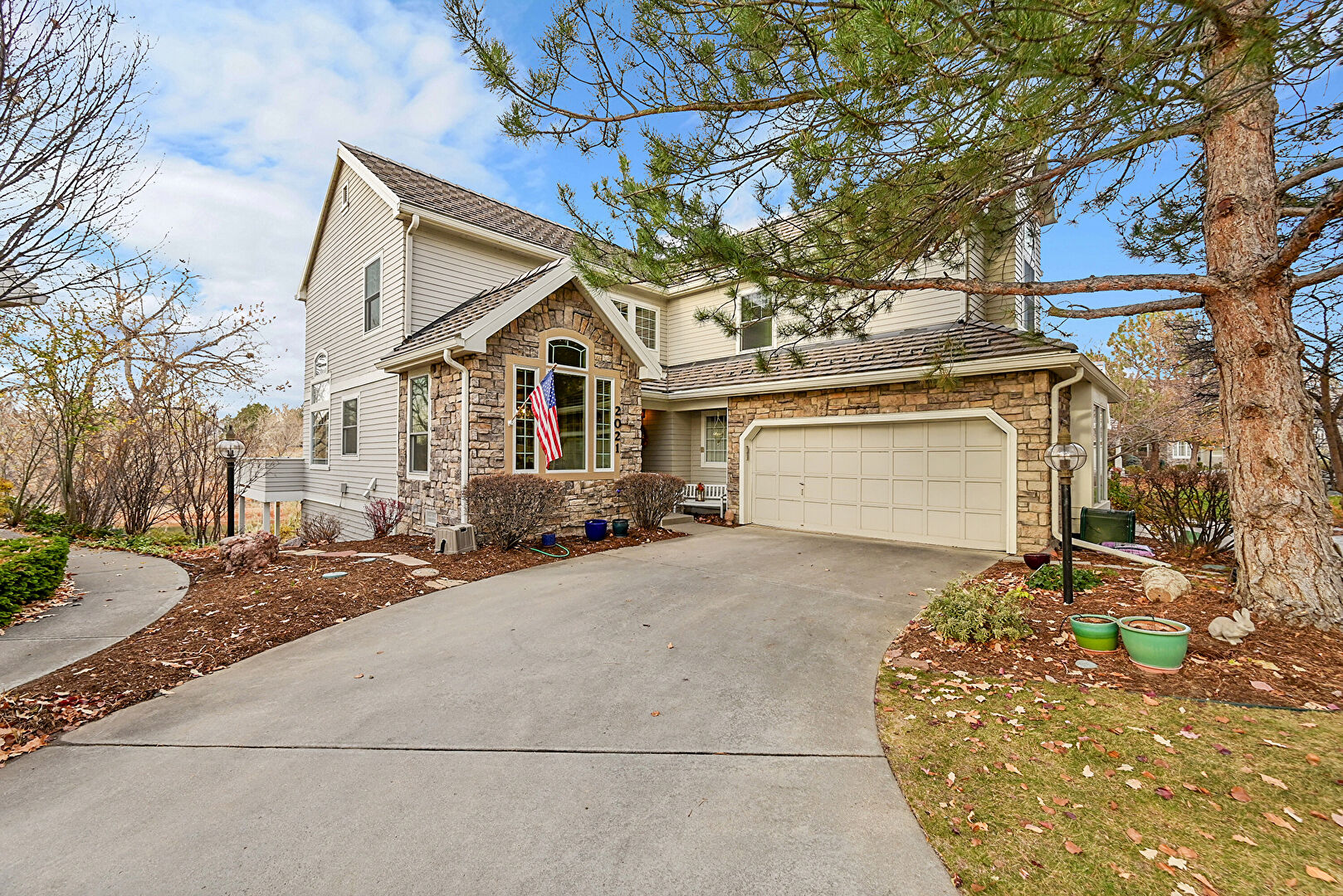 Built In Garage, Downspout, Driveway, Garage, Gutters, Horizontal Siding, Lawn, Stone Siding, Downspout, Horizontal Siding, Lawn, Shingle Roof