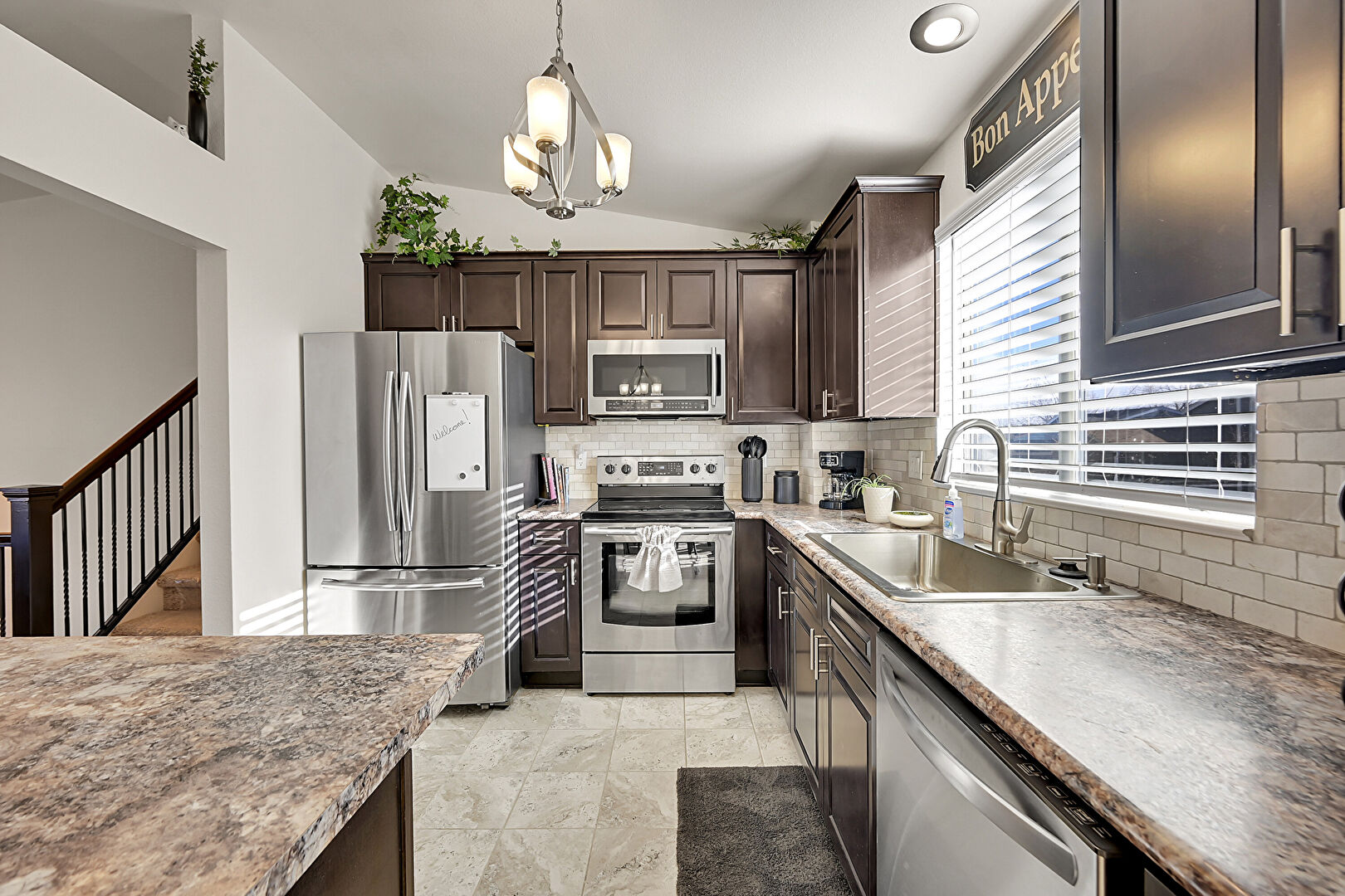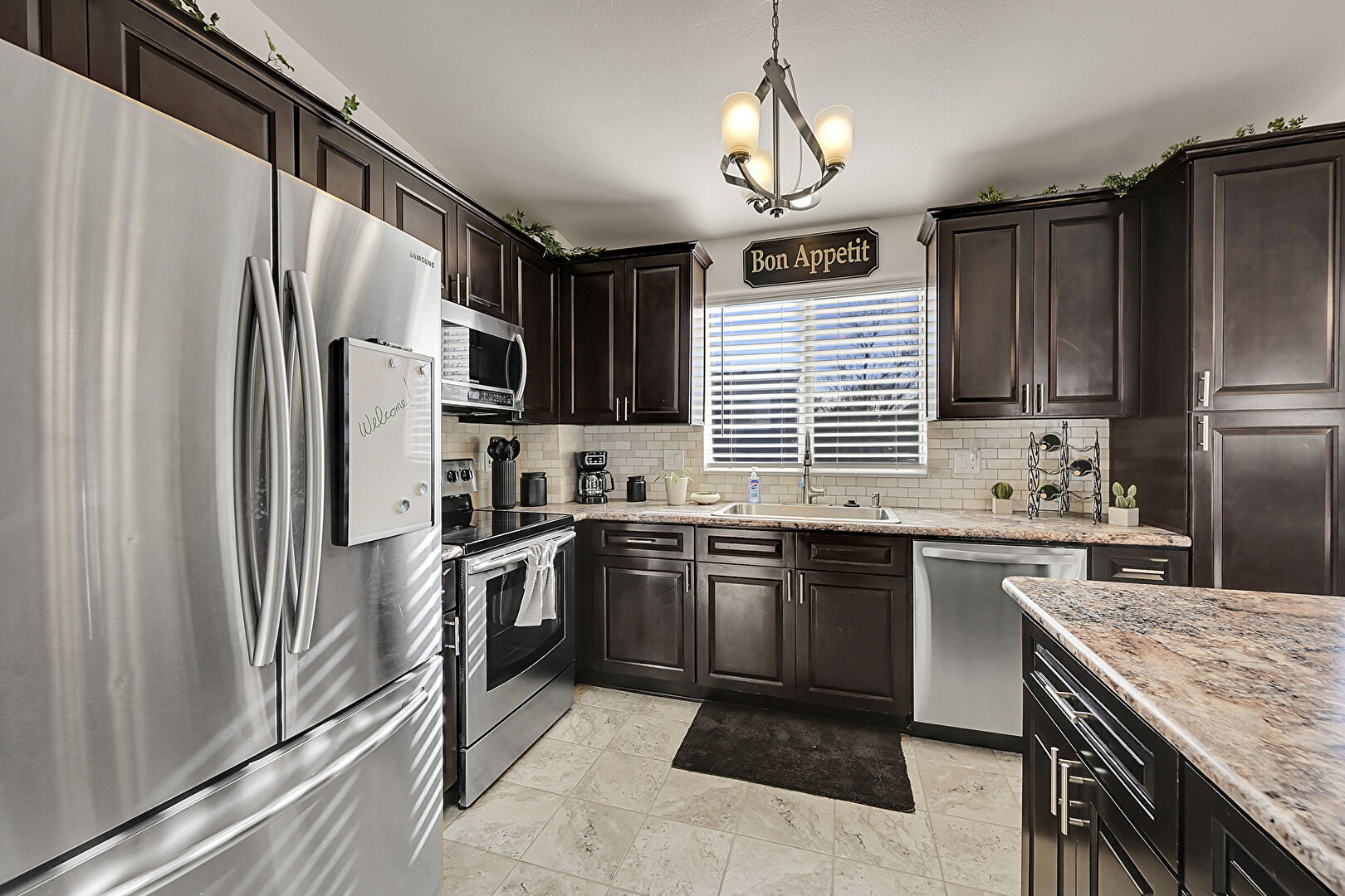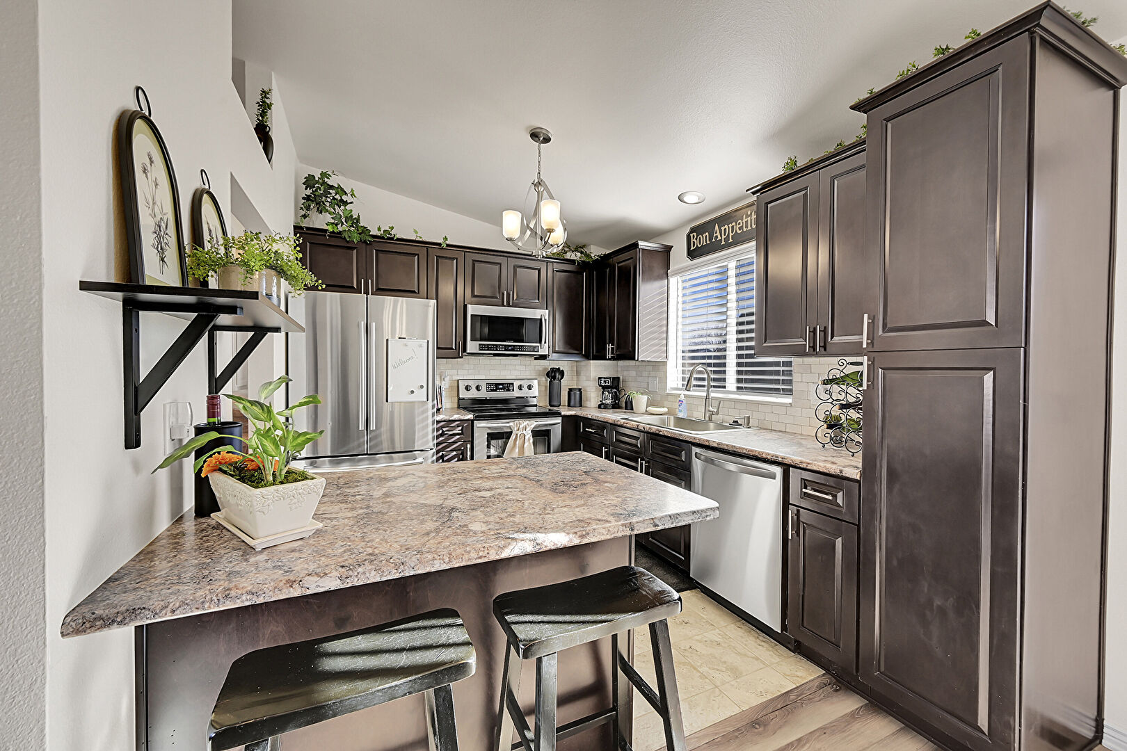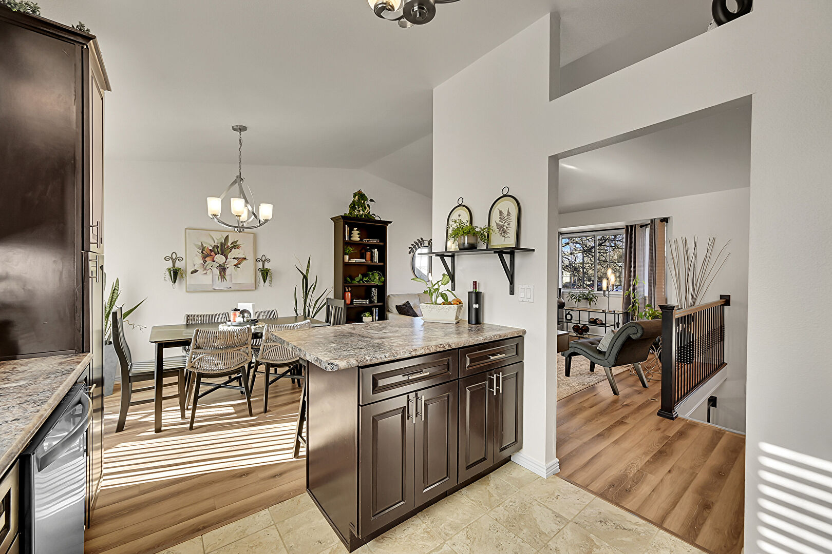 Baseboards Wall, Crown Molding Cabinets, Dark Brown Cabinets, Drywall, Kitchen Bar, Kitchen Peninsula, Natural Light, Notable Chandelier, Open Shelves, Pendant Lighting, Raised Cabinets, Recessed Lighting, Stone Countertops, Tile Floor, U Shaped Kitchen, Vaulted Ceiling, Wood Finish Floor, Natural Light, Notable Chandelier, Raised Cabinets, Stone Countertops