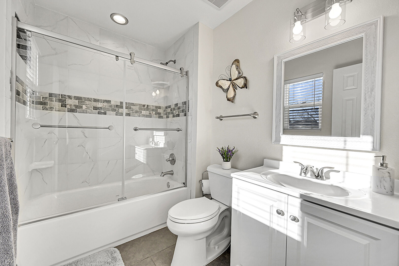 Baseboards Wall, Combined Bath Shower, Drywall, Full Bathroom, Half Bathroom, Textured Wall, Tile Floor, Vanity, Vent, Wood Finish Floor, Drywall, Full Bathroom, Natural Light
