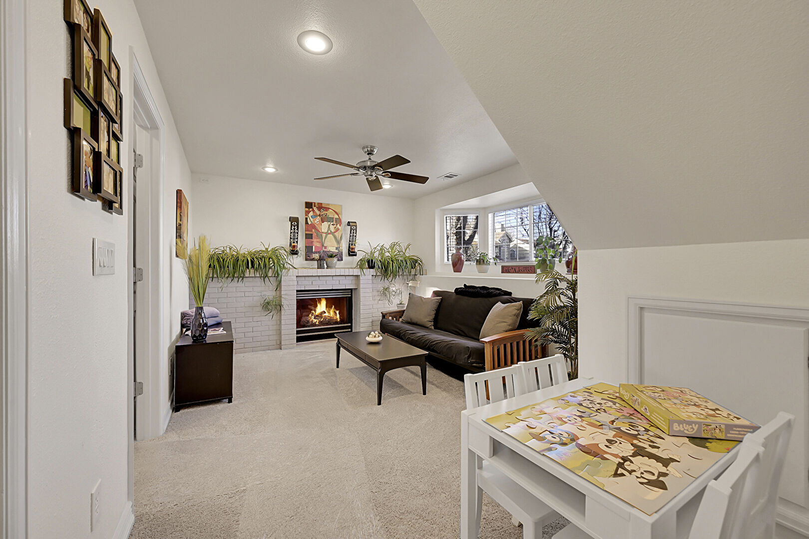Baseboards Wall, Carpet, Drywall, Fireplace, Natural Light, Notable Chandelier, Recessed Lighting, Stairs, Vaulted Ceiling, Vent, Wood Finish Floor, Ceiling Fan, Drywall, Notable Chandelier, Vaulted Ceiling