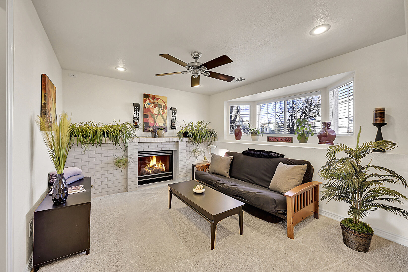 Ceiling Fan, Drywall, Fireplace, Natural Light, Stairs, Vent, High Ceiling