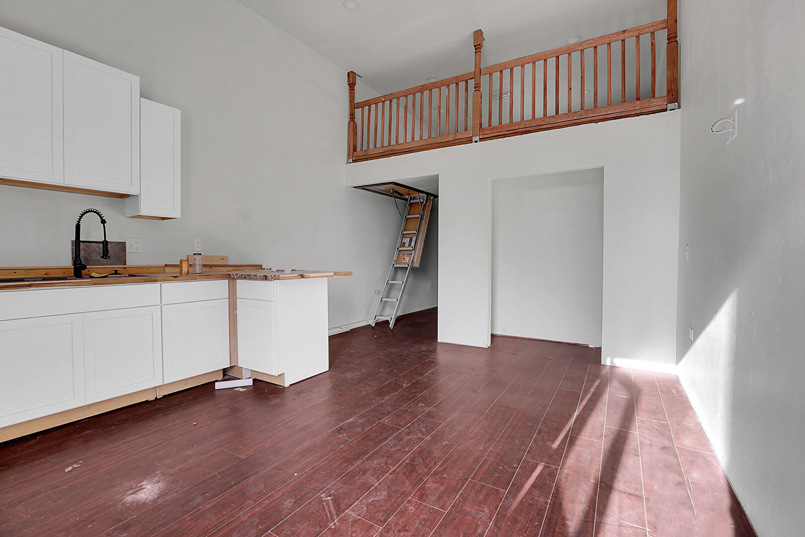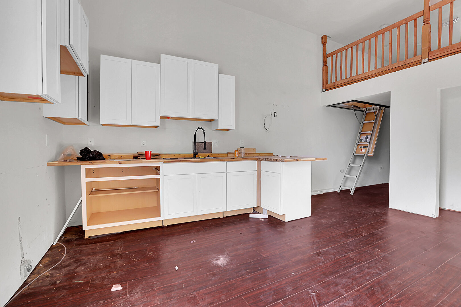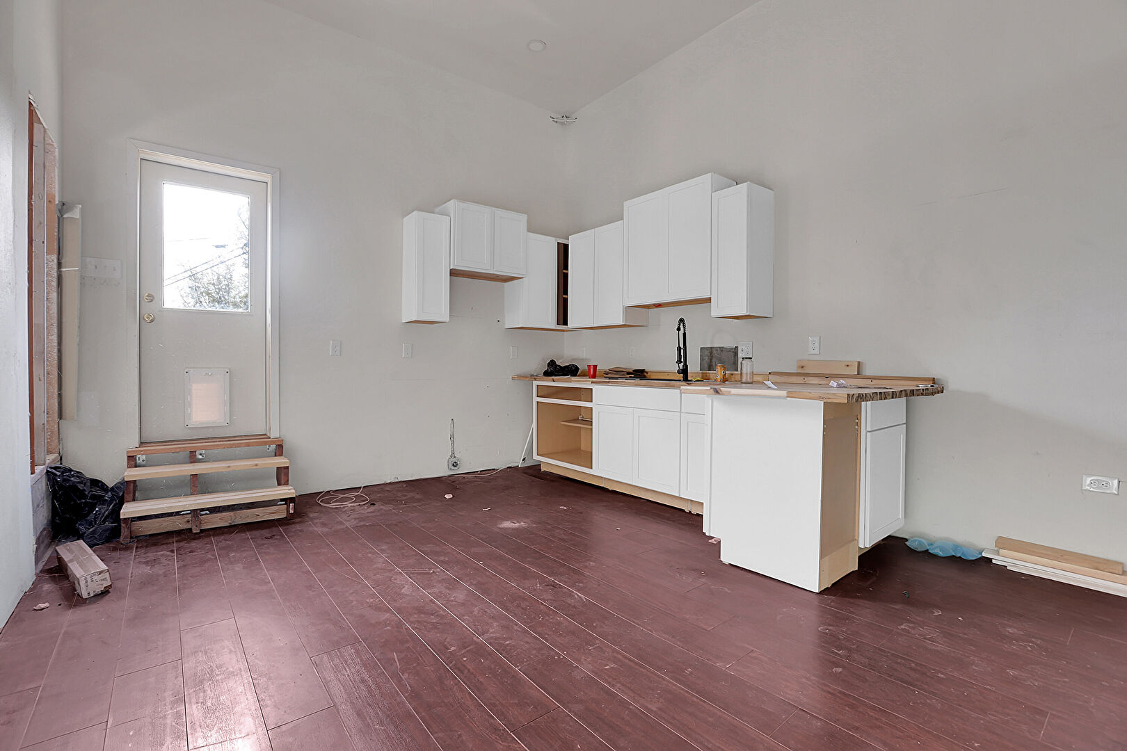 Baseboards Wall, Butcher Block Countertops, Drywall, High Ceiling, Natural Light, Shaker Cabinets, Wood Finish Floor, Butcher Block Countertops, Drywall, Open Shelves