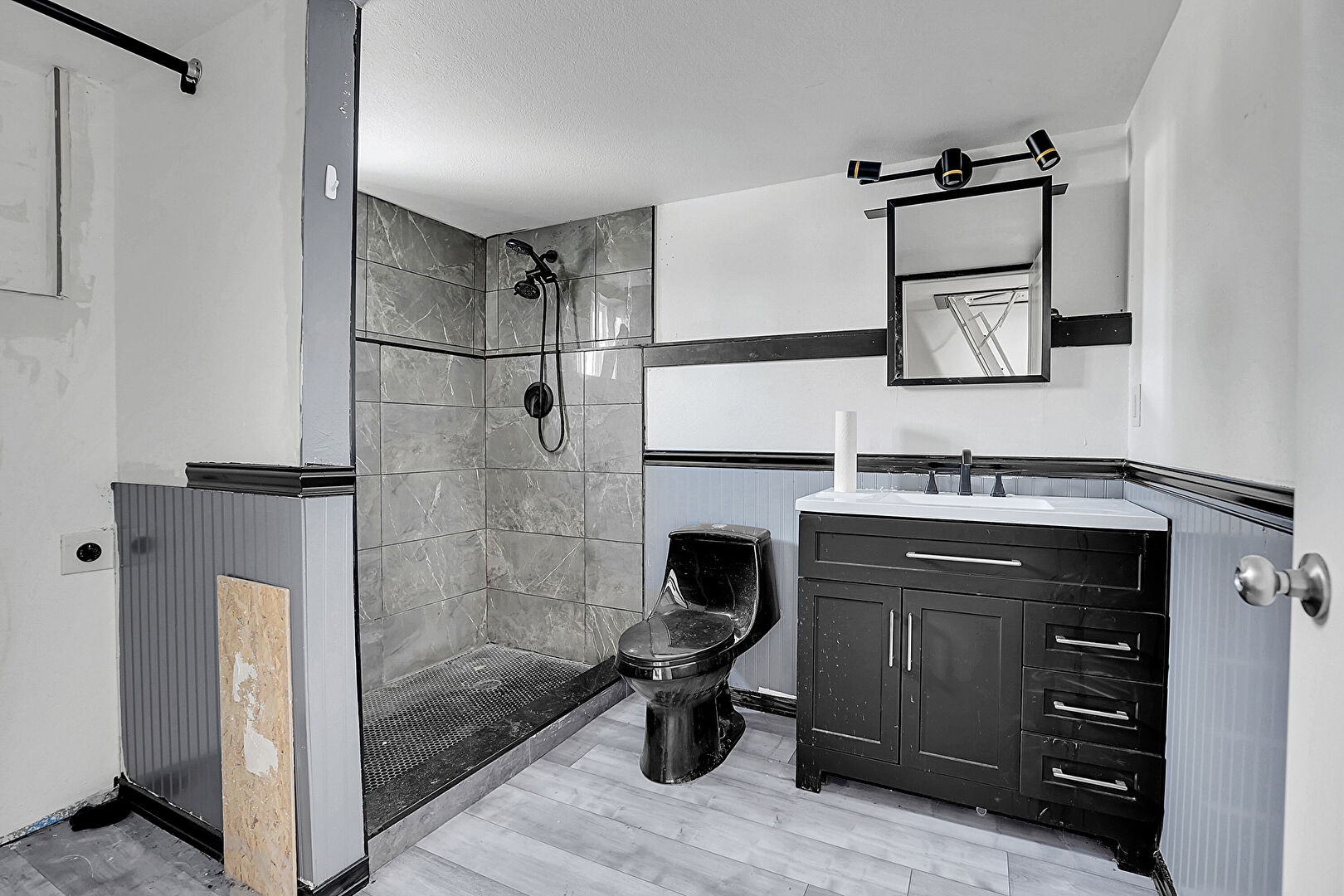 Full Bathroom, Vanity, Wainscot Wall, Wood Finish Floor, Wood Wall, Drywall