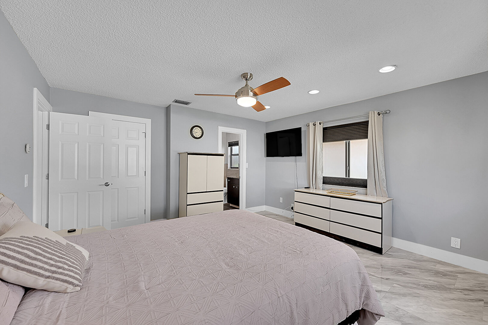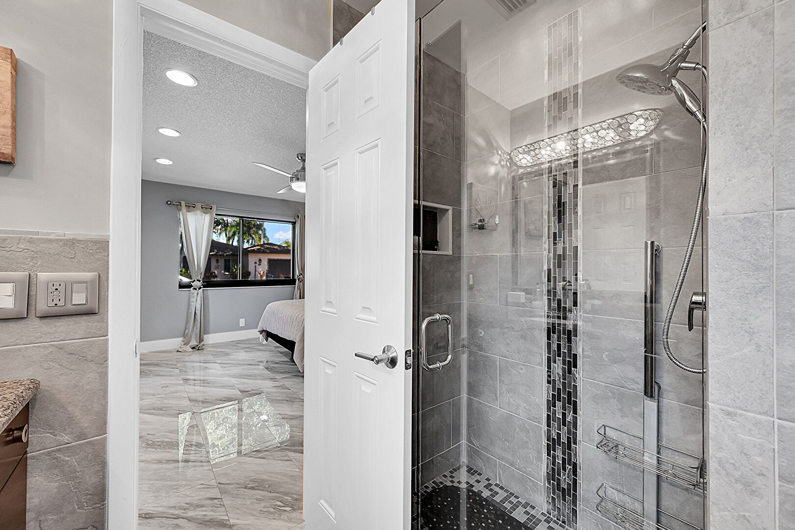 Baseboards Wall, Ceiling Fan, Drywall, Ensuite Bathroom, Full Bathroom, Marble Finish Floor, Natural Light, Recessed Lighting, Textured Ceiling, Tile Floor, Tile Wall, Vanity, Vent, Wainscot Wall, Drywall, Full Bathroom, Vent