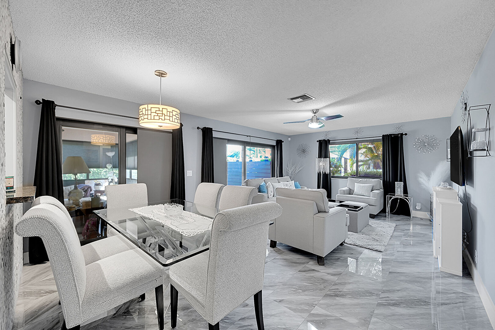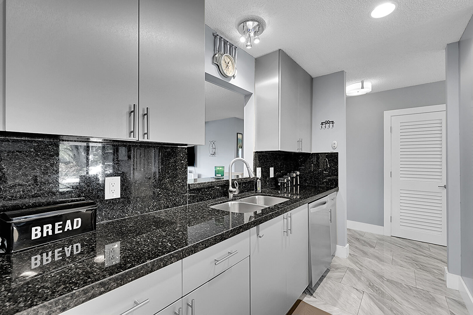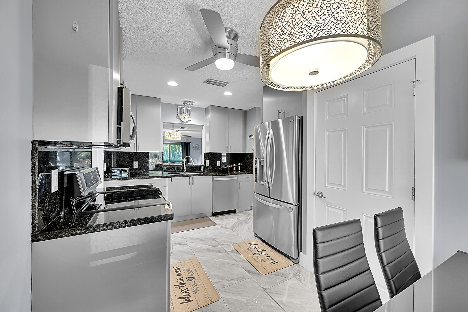 Baseboards Wall, Ceiling Fan, Drywall, Flat Panel Cabinets, Gray Cabinets, Marble Finish Floor, Natural Light, Pass Through Window, Pendant Lighting, Recessed Lighting, Stone Countertops, Stone Tile Countertops, Textured Ceiling, U Shaped Kitchen, Vent, Wall Mounted Ac, Ceiling Fan, Drywall, Marble Finish Floor, Pendant Lighting, Recessed Lighting, Vent