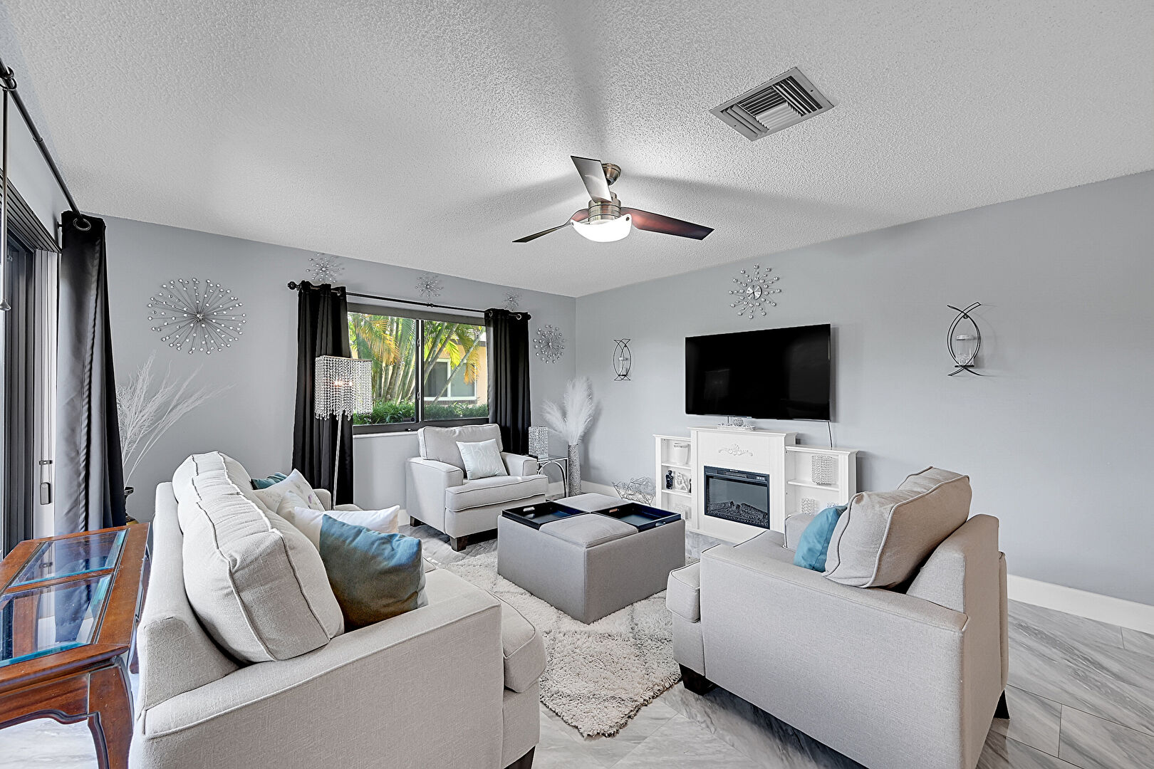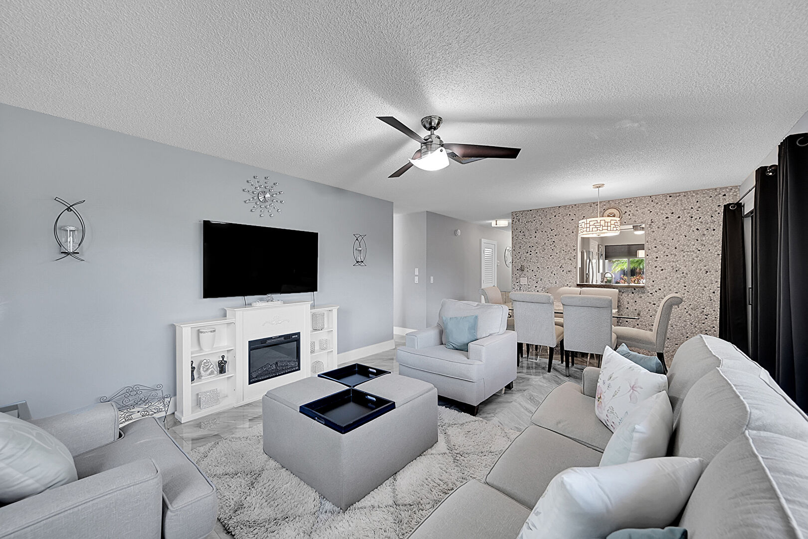 Accent Wall, Baseboards Wall, Ceiling Fan, Drywall, Fireplace, Marble Finish Floor, Natural Light, Textured Ceiling, Vent, Wallpaper Wall, Drywall, Marble Finish Floor, Textured Ceiling