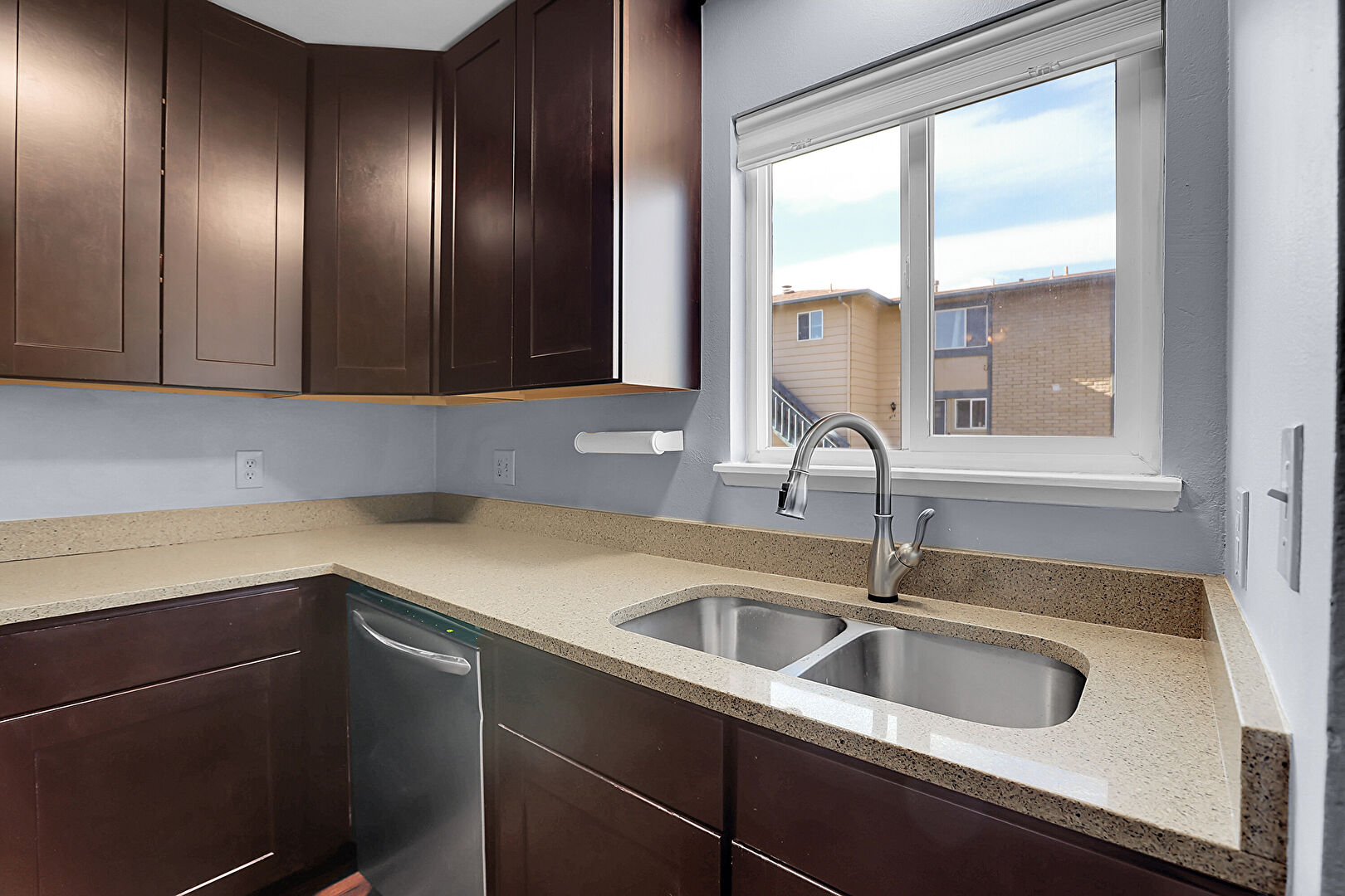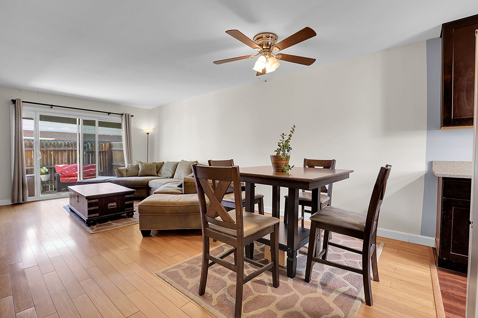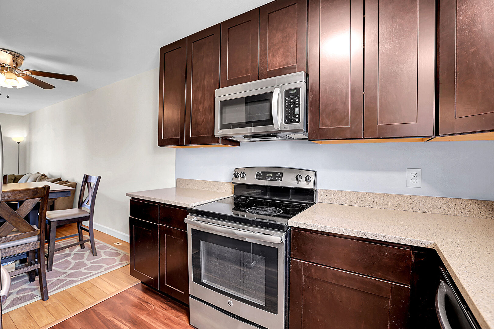 Baseboards Wall, Ceiling Fan, Dark Brown Cabinets, Drywall, Natural Light, Opens To Living Area, Shaker Cabinets, Stone Countertops, Wood Finish Floor, Dark Brown Cabinets, Drywall, Shaker Cabinets, Stone Countertops, Wood Finish Floor
