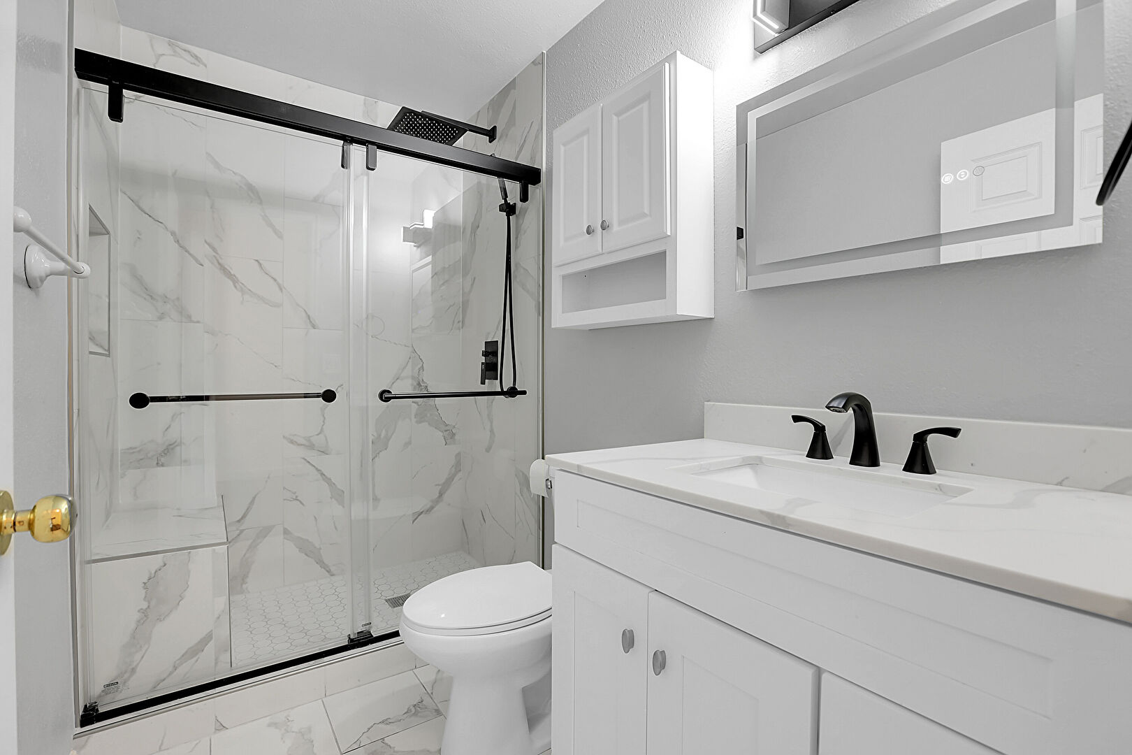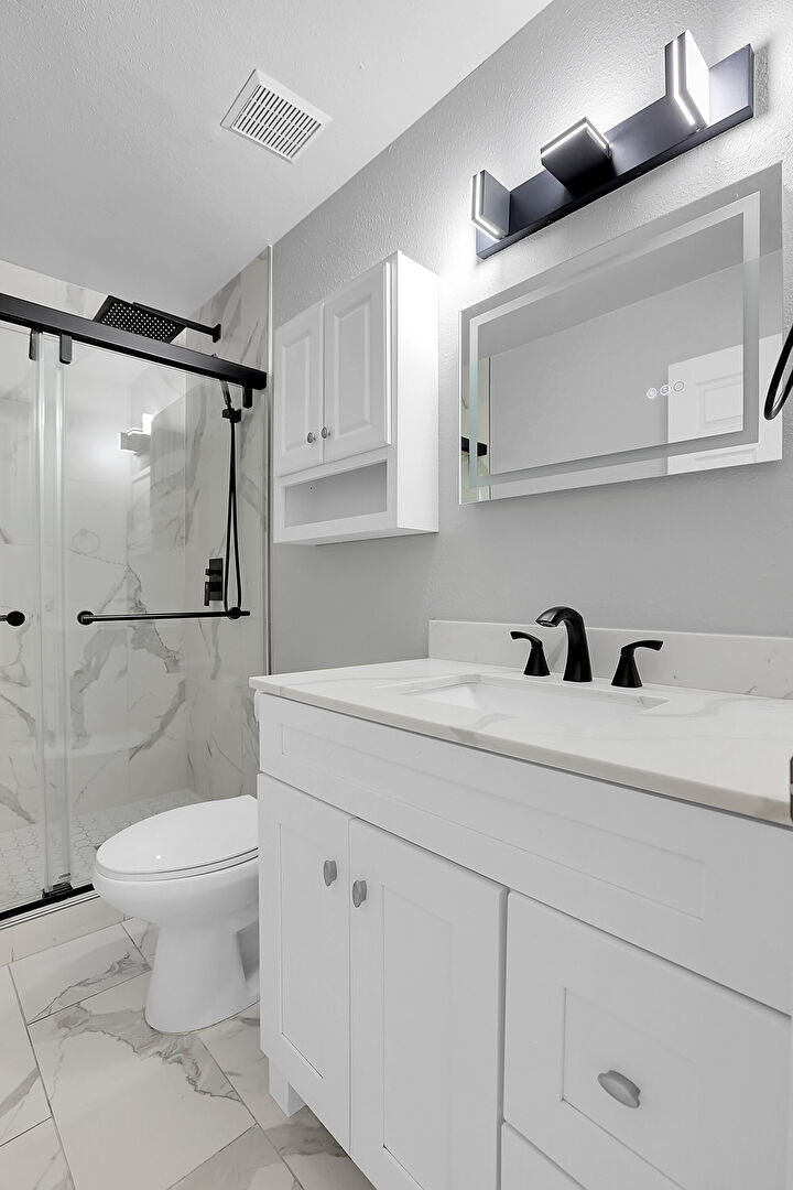 Drywall, Full Bathroom, Marble Finish Floor, Textured Wall, Vanity, Full Bathroom, Vanity, Vent