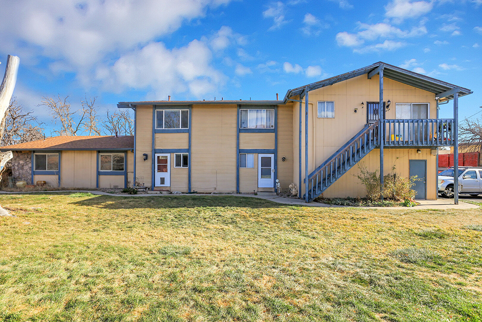 Balcony, Built In Garage, Downspout, Driveway, Fence, Gutters, Satellite Dish, Stairs, Vertical Siding, Wall Mounted Ac, Lawn, Wood Siding