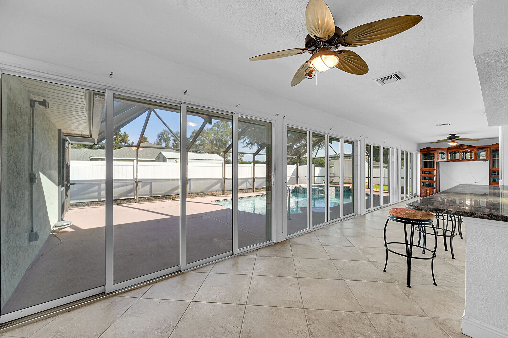 Baseboards Wall, Ceiling Fan, Decorative Columns, Drywall, French Doors, Kitchen Bar, Kitchen Peninsula, Lanai, Natural Light, Stone Countertops, Tile Floor, Vent