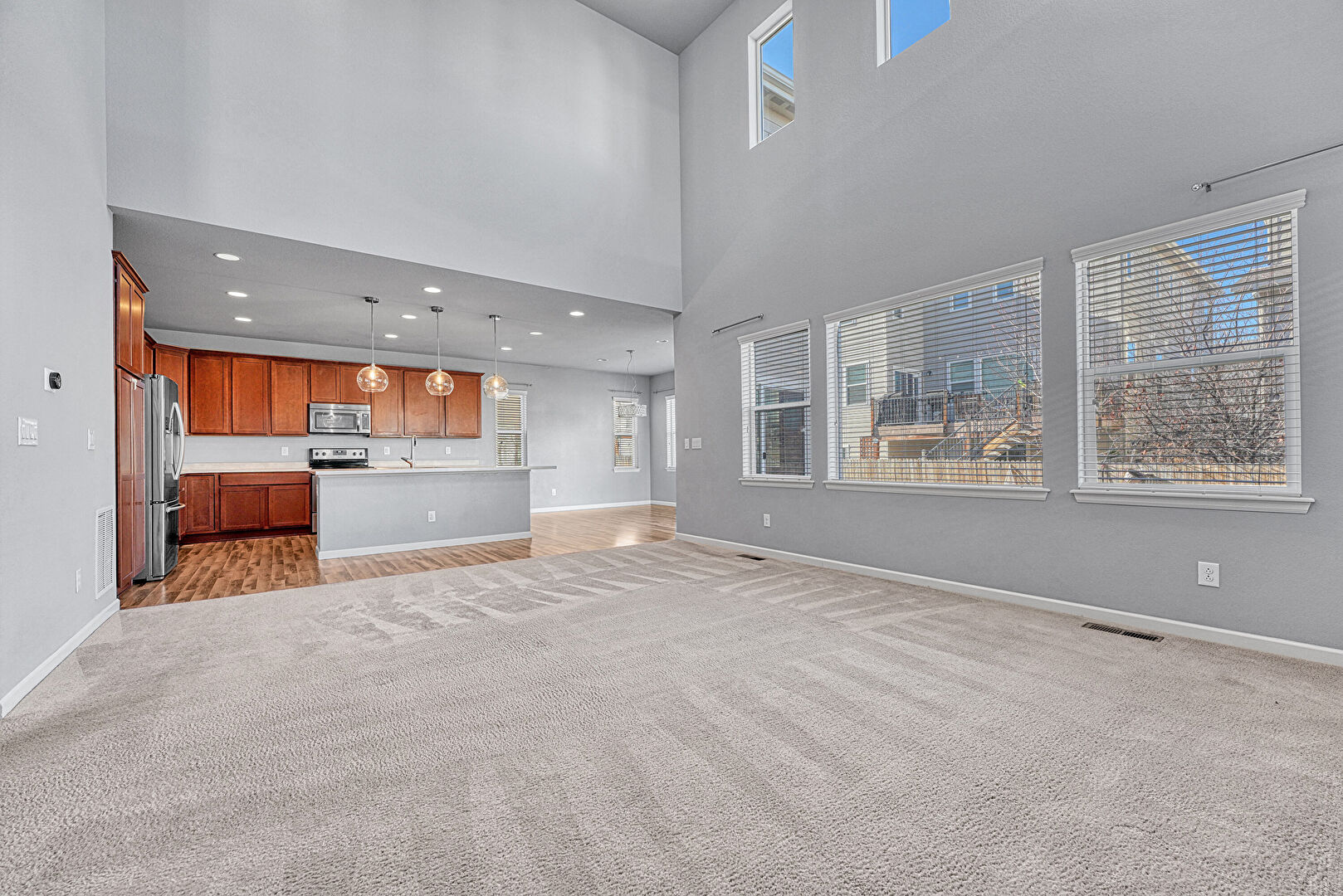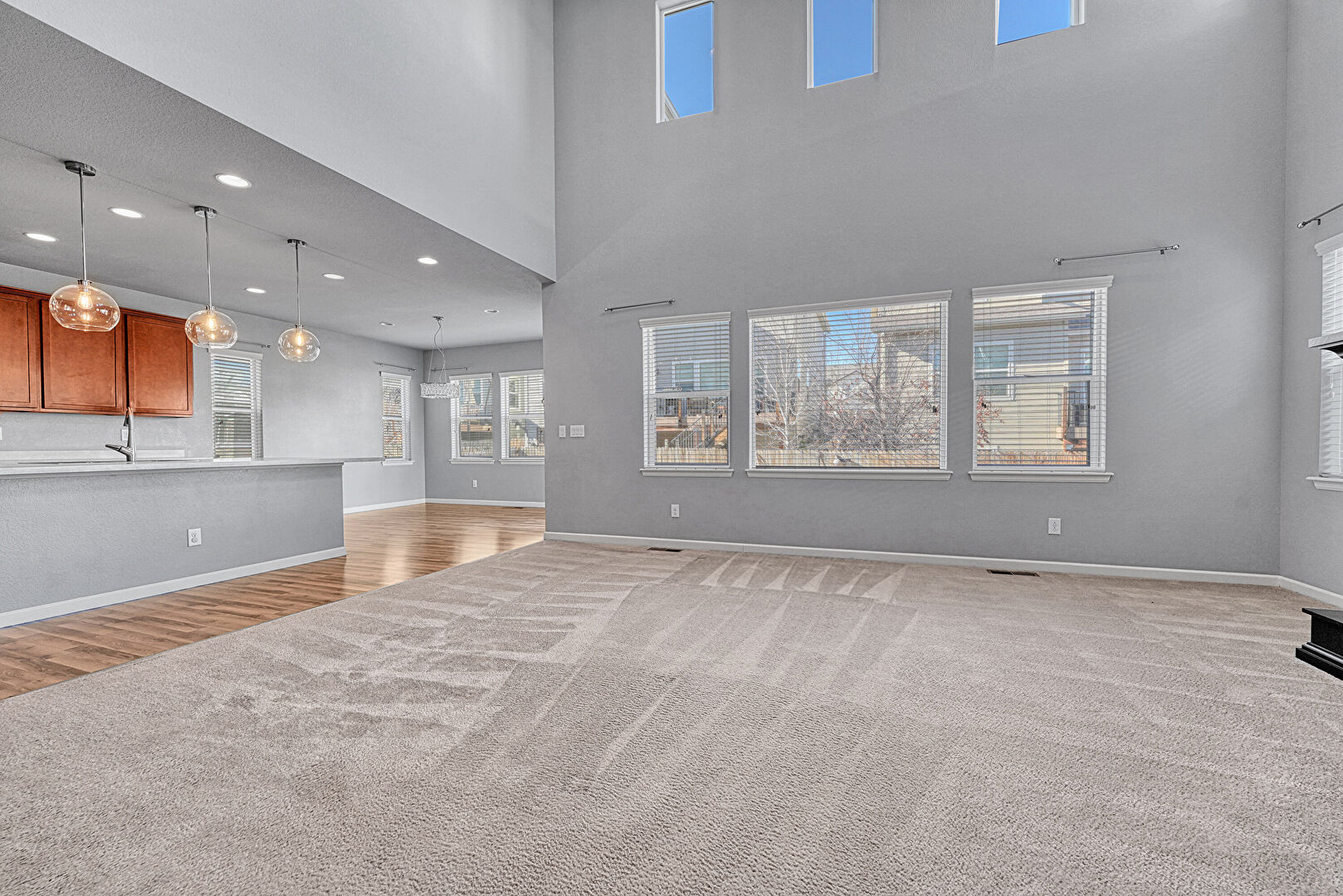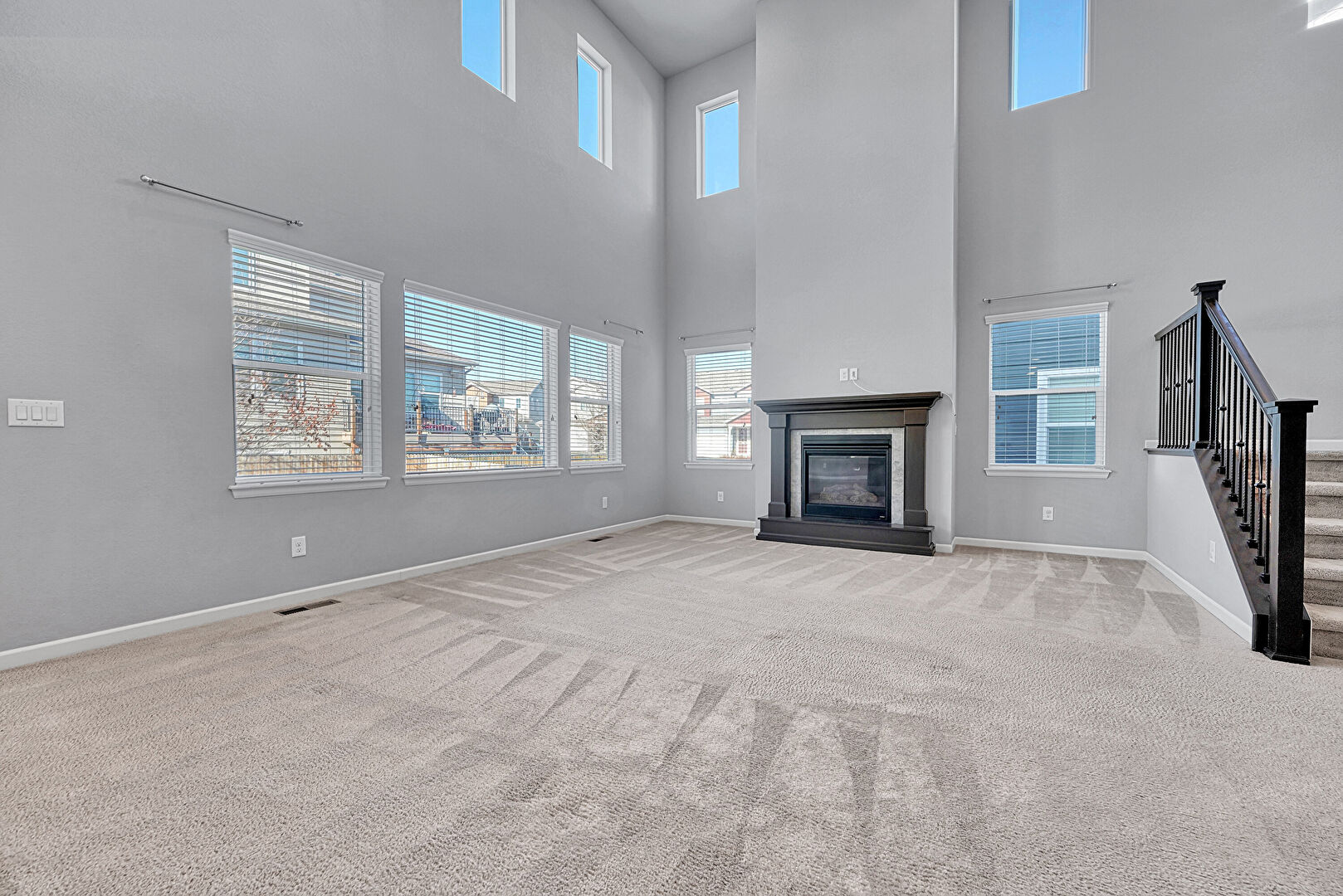 Baseboards Wall, Carpet, Drywall, Fireplace, High Ceiling, L Shaped Kitchen, Natural Light, Recessed Lighting, Stairs, Vent, Baseboards Wall, Fireplace, High Ceiling, Wood Finish Floor