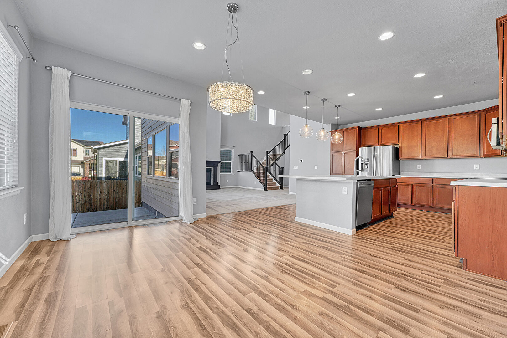 Baseboards Wall, Drywall, Kitchen Island, L Shaped Kitchen, Medium Brown Cabinets, Natural Light, Notable Chandelier, Opens To Living Area, Pendant Lighting, Recessed Lighting, Shaker Cabinets, Textured Ceiling, Wood Finish Floor, Fireplace, Natural Light