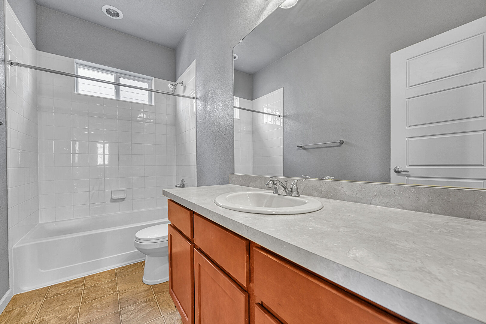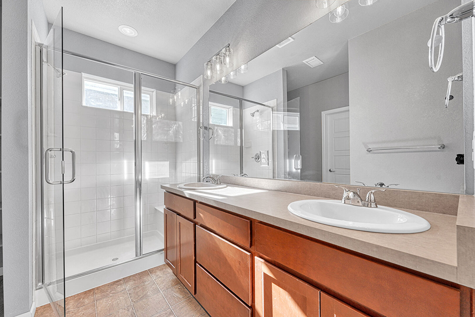 Baseboards Wall, Carpet, Double Vanity, Drywall, Full Bathroom, Textured Ceiling, Tile Floor, Full Bathroom, Natural Light